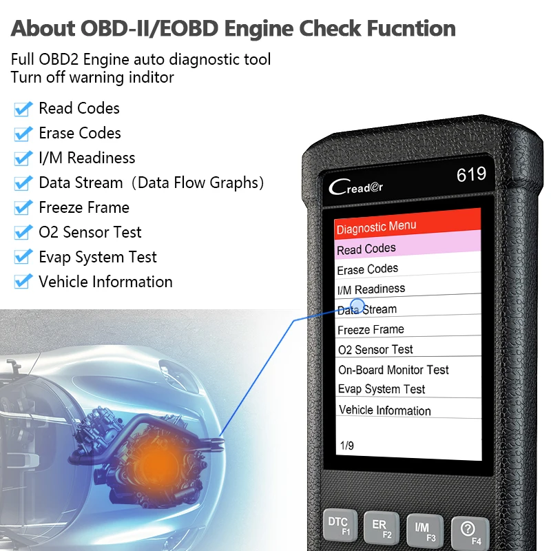 Engine Code Reader Feature 1O2 Sensor Monitoring,I/M Readiness