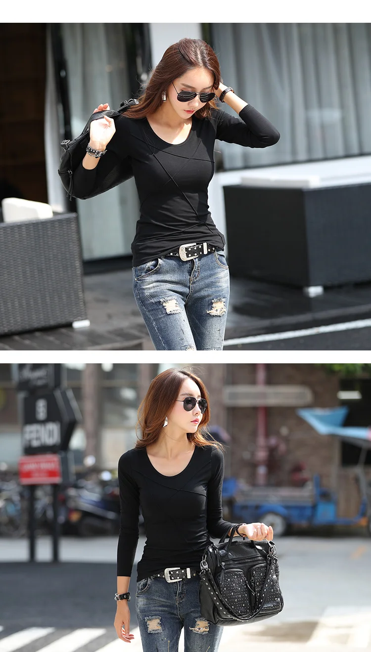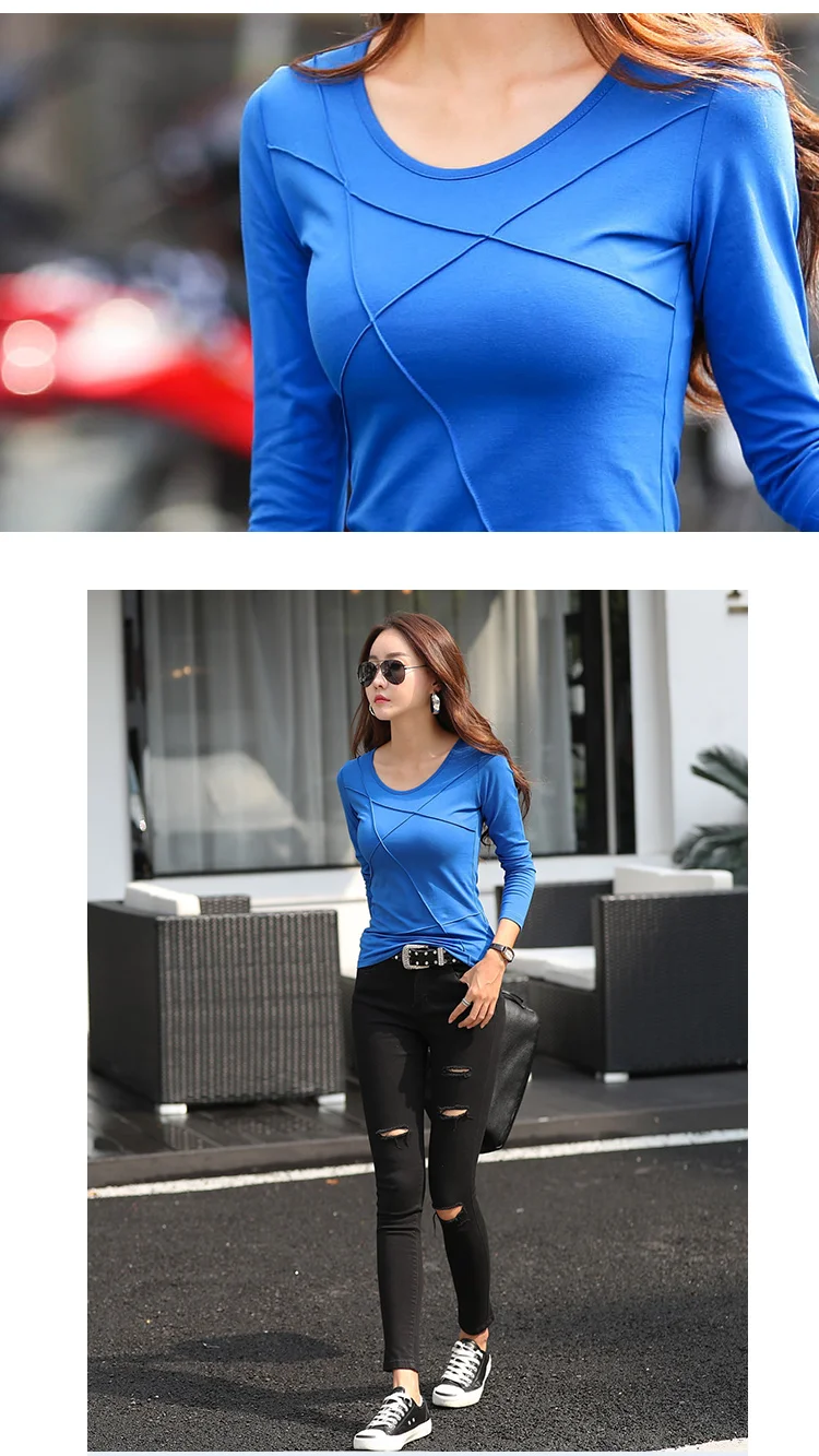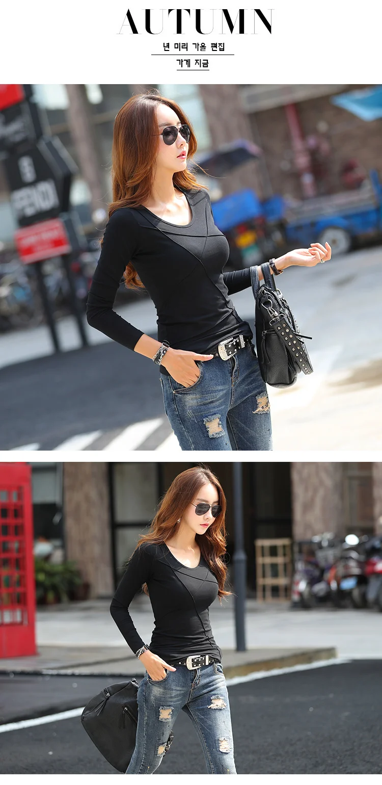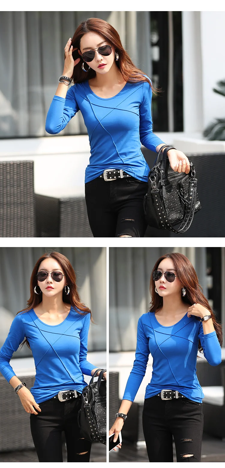 Женская футболка с длинными рукавами, однотонная хлопковая футболка в Корейском стиле, для весны и осени