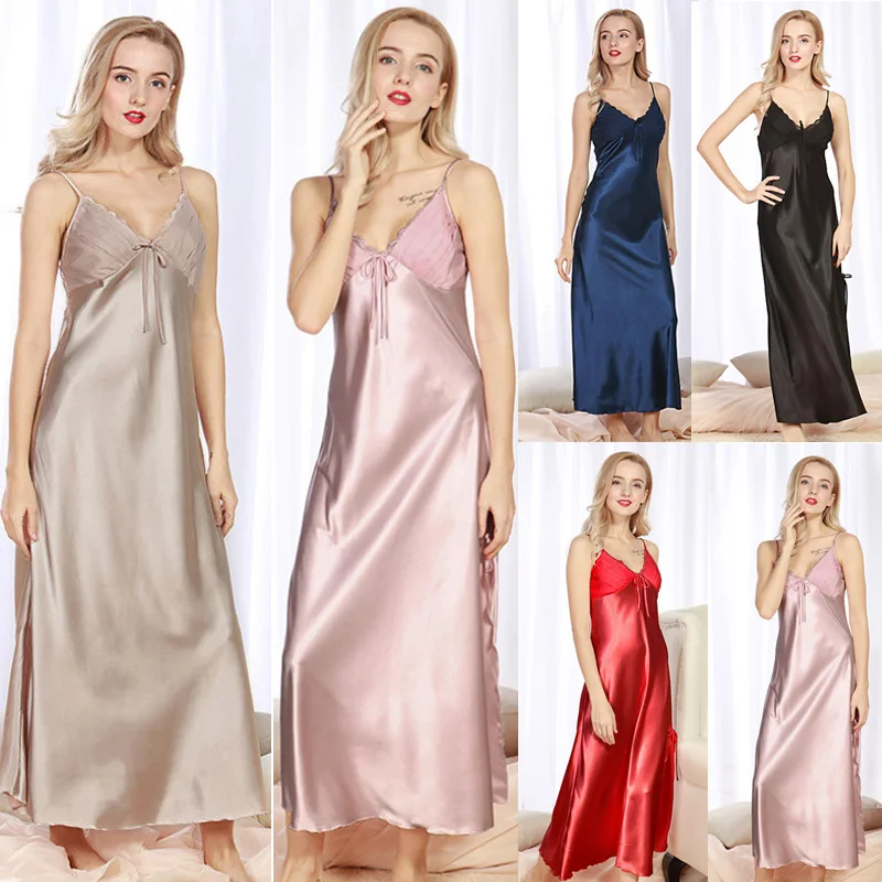 Женская Длинная Ночная рубашка из искусственного шелка, с V-образным вырезом, на бретелях