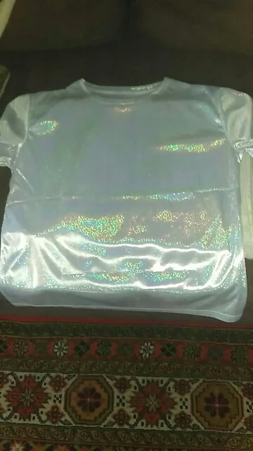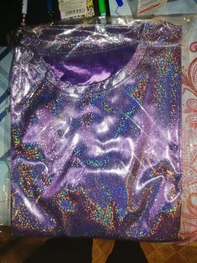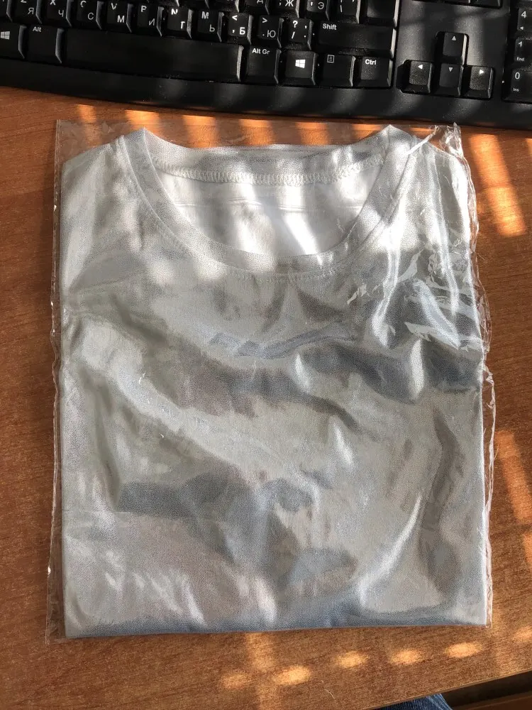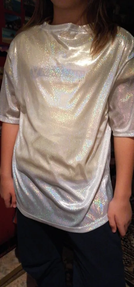 Дата заказа 25.11. Отправляли долго, но за то сразу 12 посылок. Пришло 14.12. Дата получения 15.12. Доставка в магазин пятерочка. Доставлено за 11 дней, с другими посылками объединенными в один пакет. Упаковано нормально, пришло без повреждений. Товар соответствует описанию и картинкам продавца. Качество хорошое, сделано все аккуратно. Материал тонкий, немного просвечивает, но когда на теле все хорошо. Красивая голография, футболка вся сияет. Размер подошел, сидит свободно. Покупкой довольна, спасибо. Всем рекомендую.