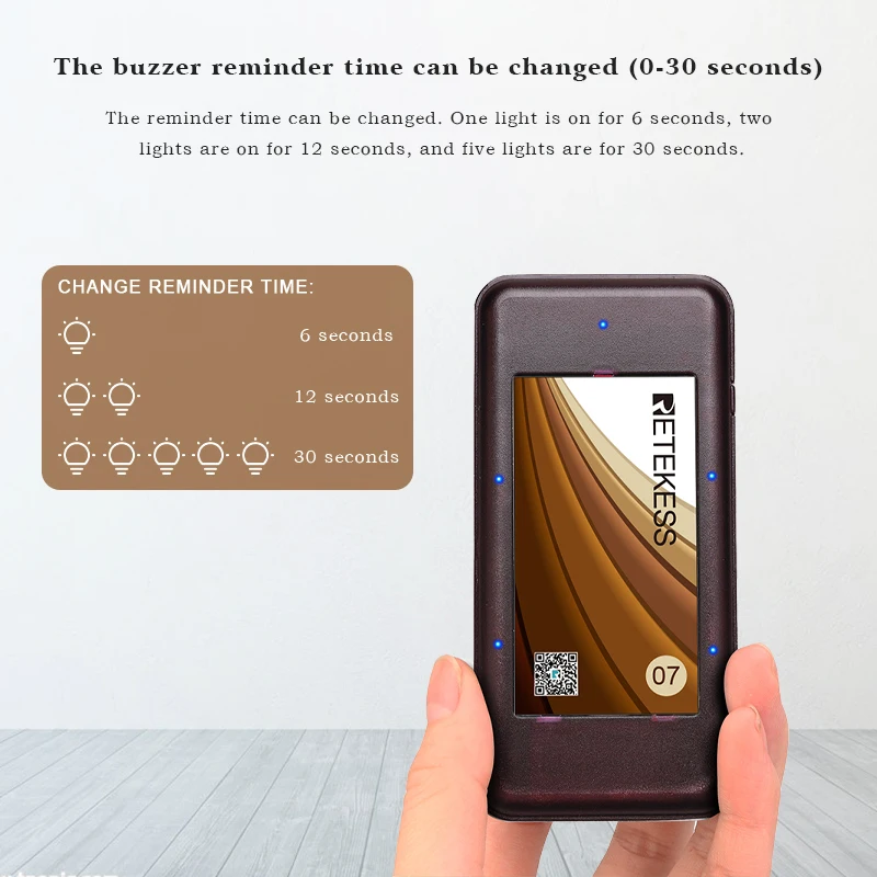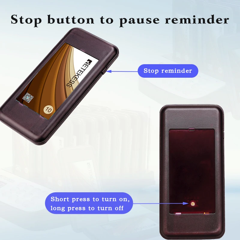 6. На боковой стороне зуммера есть кнопка остановки, которая может использоваться для остановки напоминания; Есть кнопка под рекламной бумагой, короткое нажатие для включения, долгое нажатие для выключения