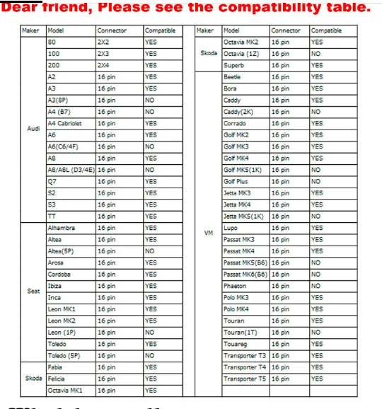 -Не совместим: Caddy (2K) / Golf MK5 (1K) / Golf Plus / Jetta MK5 (1K) / Passat MK5 (B6) / Passat MK6 (B6) / Phaeton/