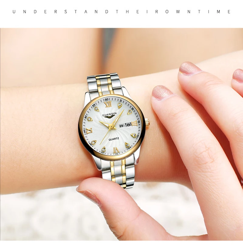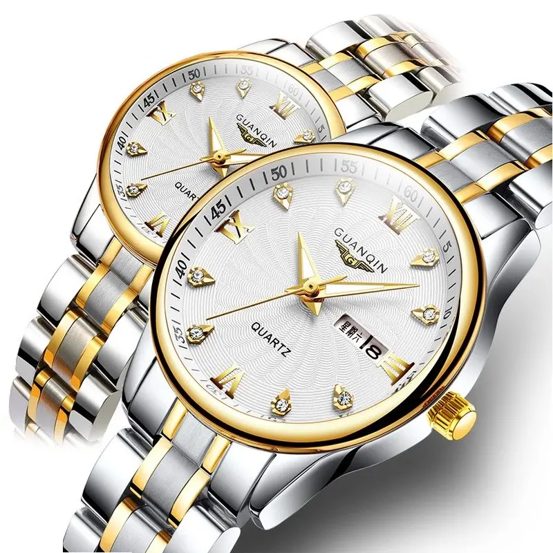 Парные часы GUANQIN, новинка, мужские и женские часы для влюбленных из нержавеющей стали, роскошные золотые кварцевые часы с датой, женские часы, мужские и женские часы