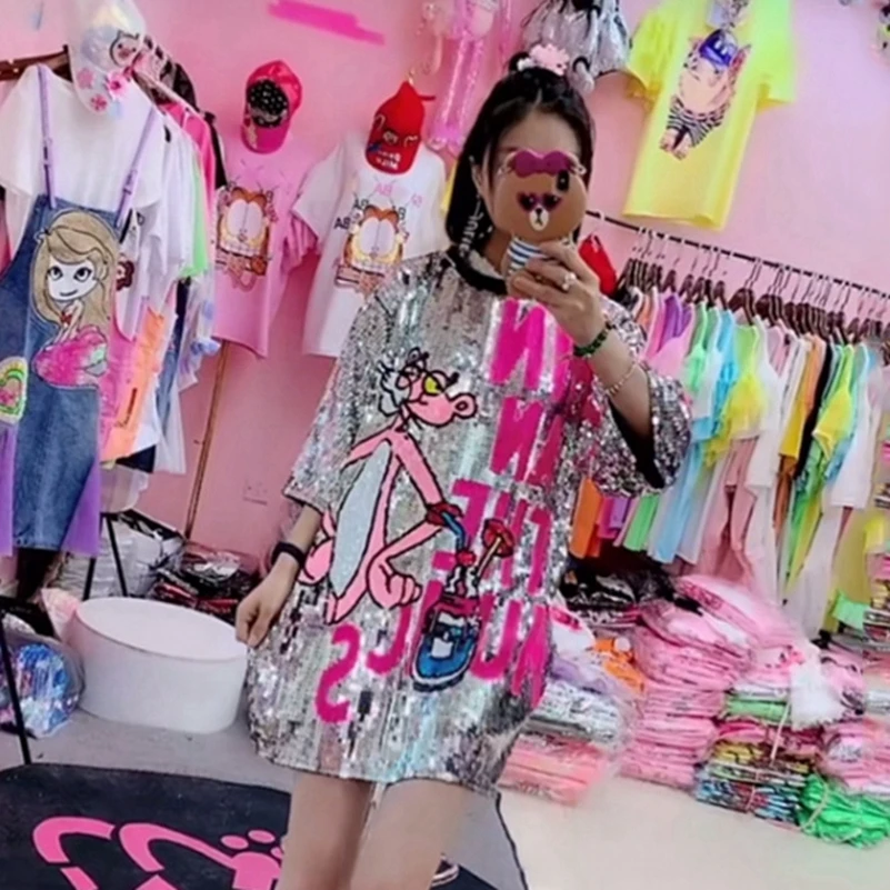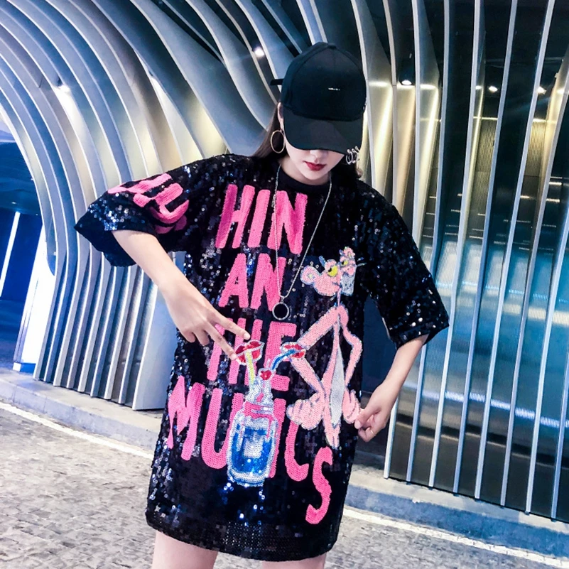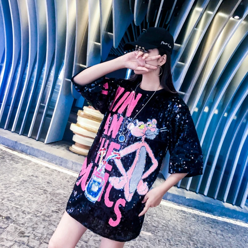 Новинка 2021, свободная футболка с круглым вырезом и пайетками, бесплатная доставка, высокое качество
