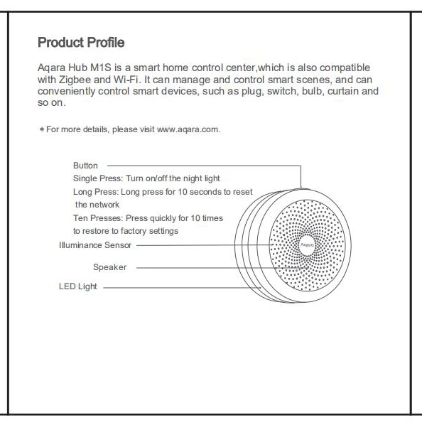 Название продукта: Aqara Hub Gateway M1S Модель продукта: ZHWG15LM Размер изделия: 80 × 80 × 41,5 мм Вес нетто продукта: 130 г Беспроводное подключение: Wi-Fi, Bluetooth, Zigbee 3,0 Работоспособное приложение: Mijia, Aqara Home, Apple HomeKit