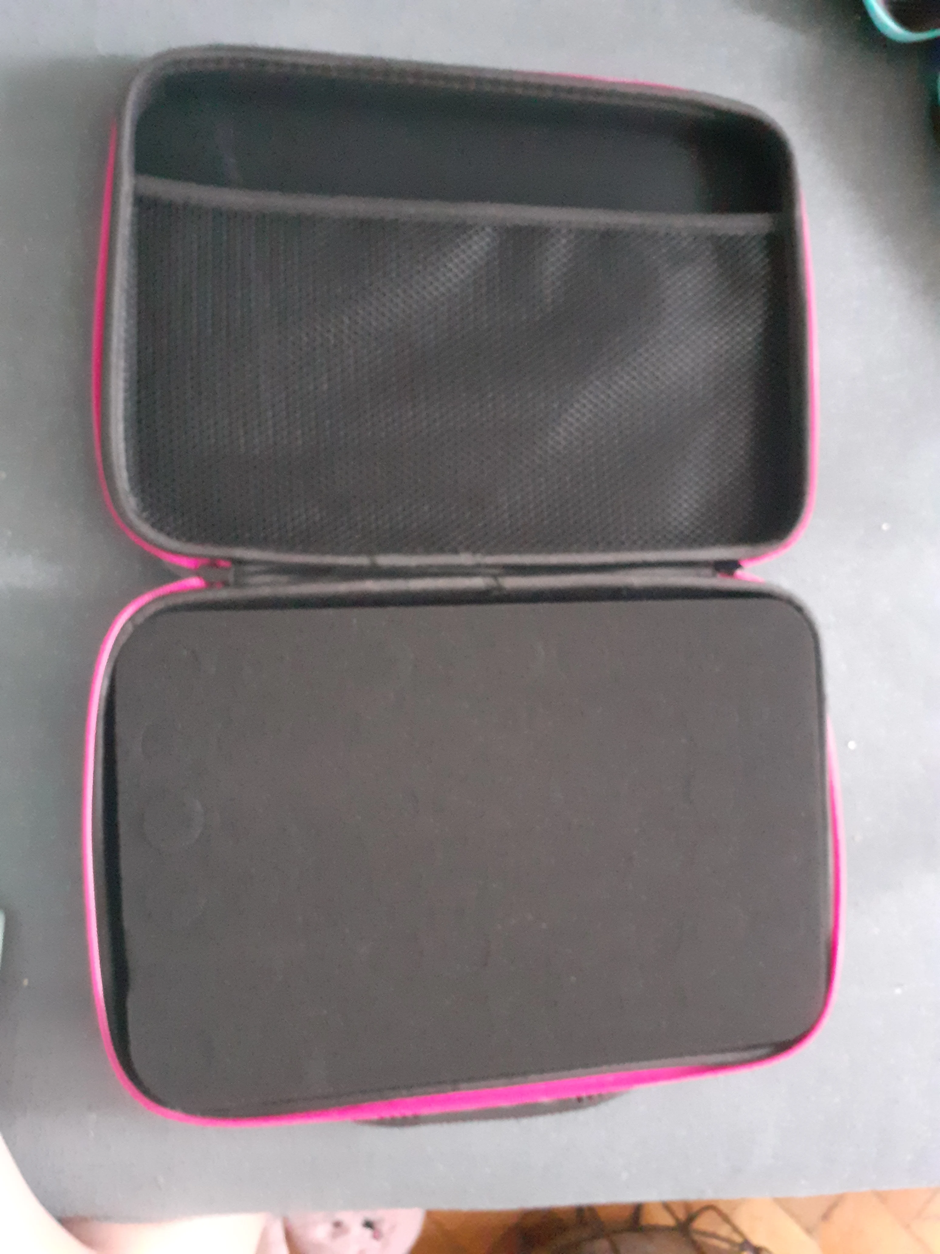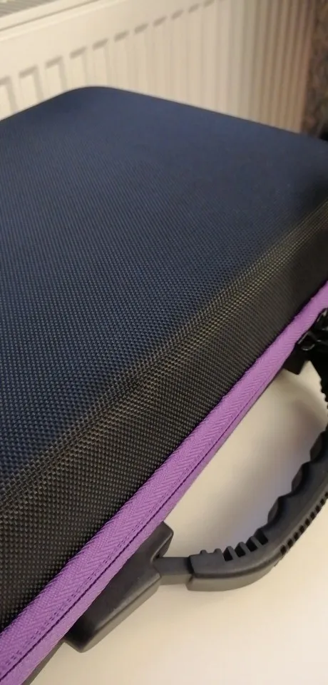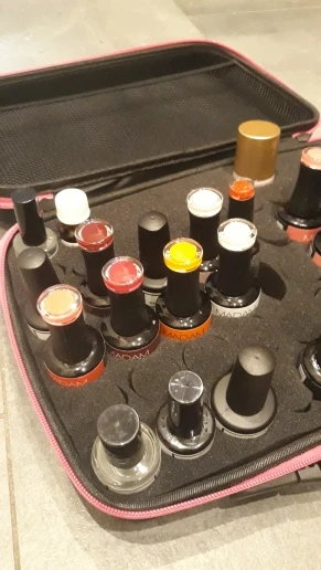 Очень красивый чемодан, красивый, солидный, красивый цвет. Будьте осторожны, есть только маленькие бутылки по 10 мл, которые можно держать внутри, потому что сетка довольно плоская. Это позор.