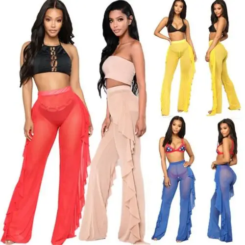 Сексуальные женские пляжные накидки с высокой талией, сексуальные прозрачные расклешенные сетчатые пляжные накидки для бикини с оборками, длинные брюки для купания