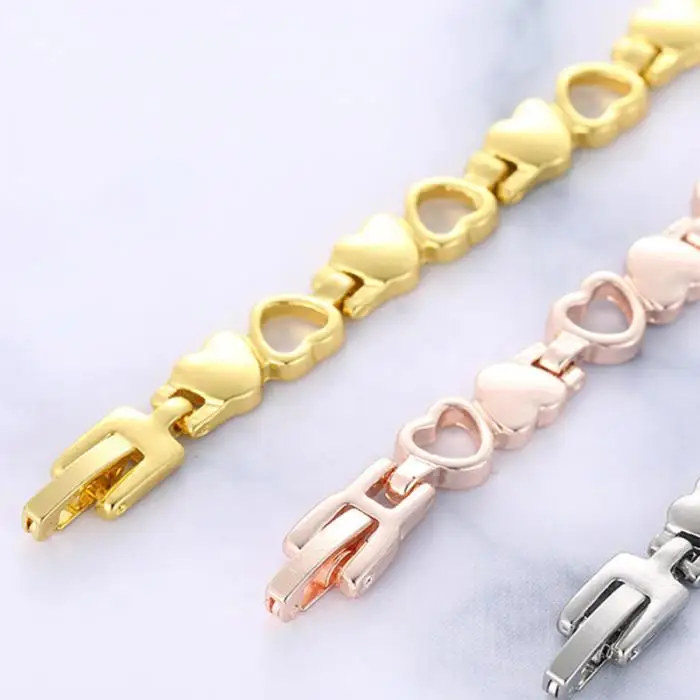 Специальный дизайн:Отличная защита от усталости, полый дизайн с сердечками, застежка с откидной крышкой, Серебряное и Золотое двухцветное вакуумное покрытие, выглядит великолепно и модно как для девушек, так и для женщин. Различные цвета, подходящие к любому наряду, стилю и настроению, этот браслет со звеньями для здоровья, безусловно, добавит впечатляющие женские штрихи к Вашему образу!
