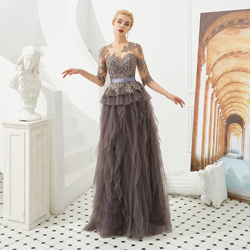 Женское свадебное платье с оборками, длинное ТРАПЕЦИЕВИДНОЕ Тюлевое платье для матери невесты, платье с рукавом до локтя и длиной в Пол, 2019