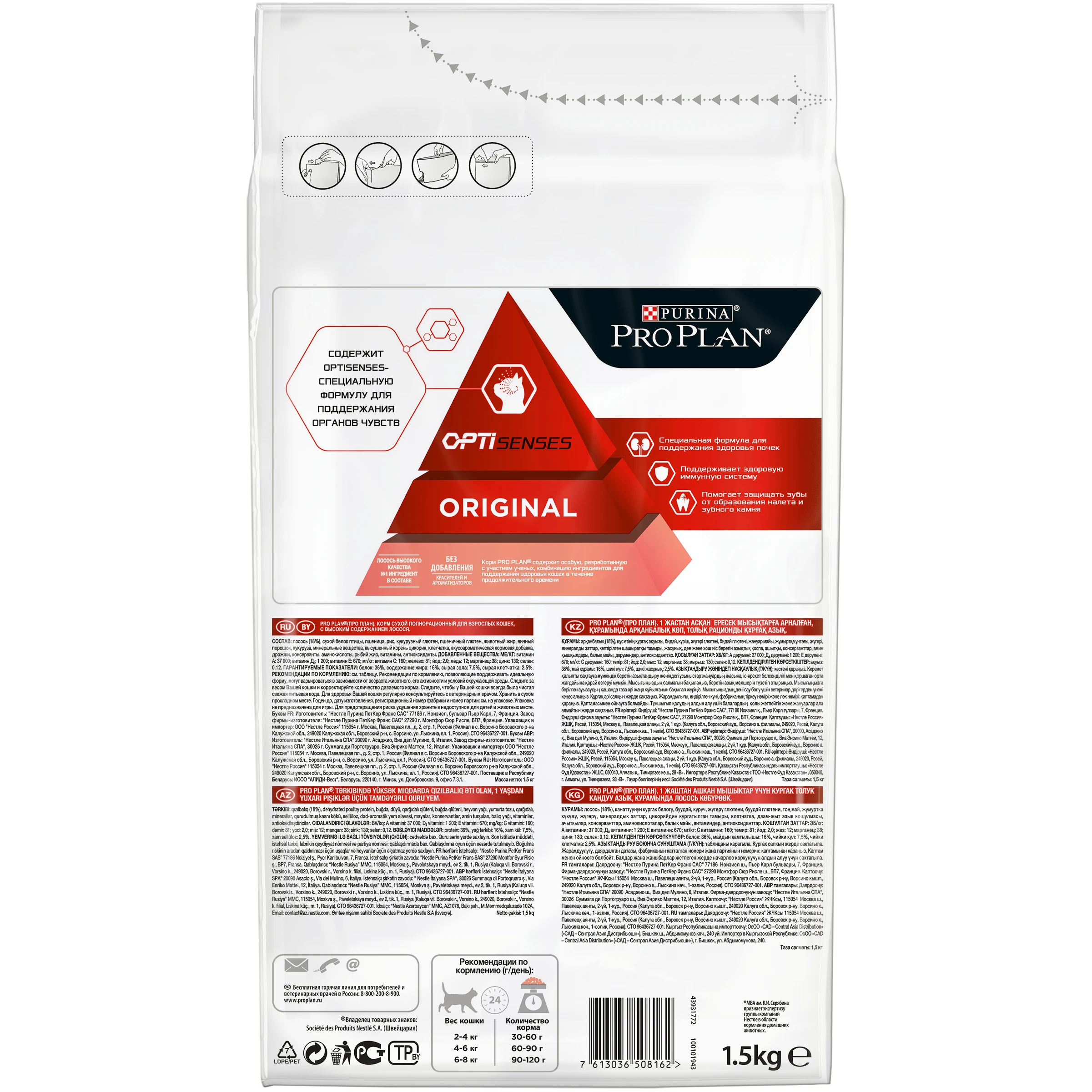 Каждый рацион линейки PRO PLAN® ORIGINAL содержит тщательно отобранные диетологами питательные вещества, которые поддерживают здоровье кошки на каждом этапе ее жизни. PRO PLAN® ORIGINAL для взрослых кошек от 1 года имеет в составе высокий уровень антиоксидантов и витаминов, в частности витамины С и Е, что обеспечивает поддержание здоровой иммунной системы. Содержит формулу OPTISENSES - особую комбинацию питательных веществ, таких как аргинин, жирные кислоты омега-3, витамины группы В и антиоксиданты для поддержания органов чувств и защиты когнитивной функции мозга кошек. Преимущества: • Содержит формулу OPTISENSES - особую комбинацию питательных веществ, таких как аргинин, жирные кислоты омега-3, витамины группы В и антиоксиданты для поддержания органов чувств и защиты когнитивной функции мозга кошек. • Высокий уровень антиоксидантов и витаминов в составе, в частности витамины С и Е, поддерживает здоровье иммунной системы, а сбалансированное сочетание питательных веществ и минералов позволяет поддерживать здоровье почек. • Защита зубов от образования зубного налета и камня благодаря хрустящей текстуре гранул и специальным минералам, препятствующим образованию зубного камня. Рекомендации по кормлению, позволяющие поддерживать идеальную форму могут варьироваться в зависимости от возраста животного, его активности и условий окружающей среды. Следите за весом Вашей кошки и корректируйте количество даваемого корма. Следите, чтобы у Вашей кошки всегда была чистая, свежая питьевая вода. Для здоровья Вашей кошки регулярно консультируйтесь с ветеринарным врачом. Состав: лосось (18%), сухой белок птицы, пшеница, рис, кукурузный глютен, пшеничный глютен, животный жир, яичный порошок, кукуруза, минеральные вещества, высушенный корень цикория, клетчатка, вкусоароматическая кормовая добавка, дрожжи, консерванты, аминокислоты, рыбий жир, витамины. Страна производства: Франция Условия хранения: В сухом прохладном месте