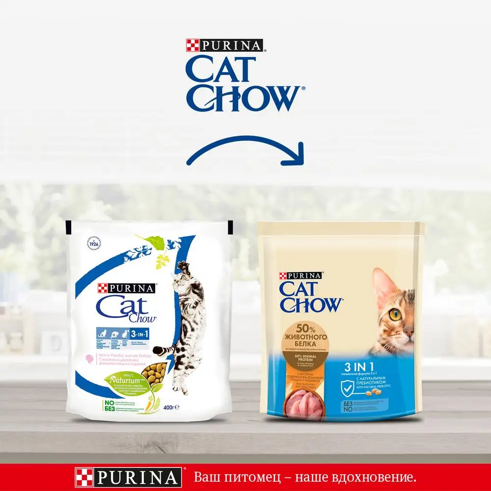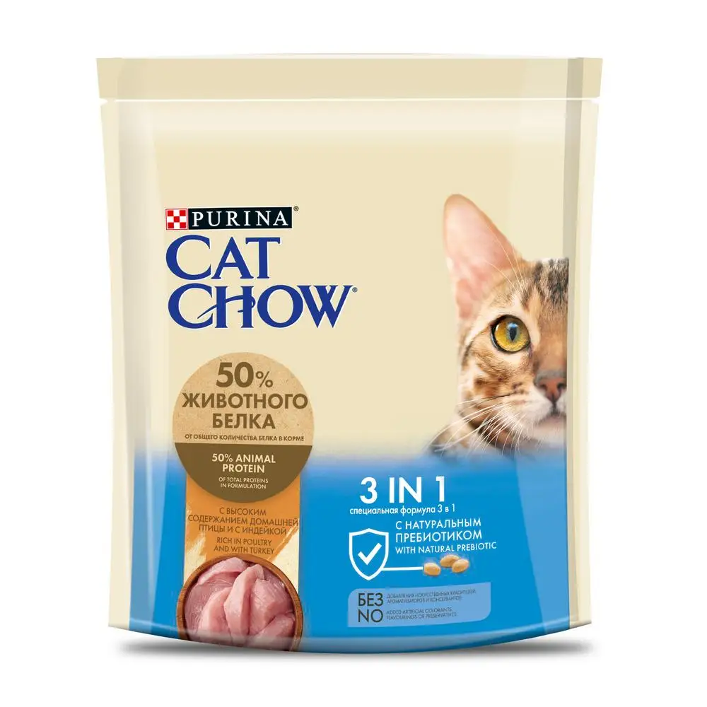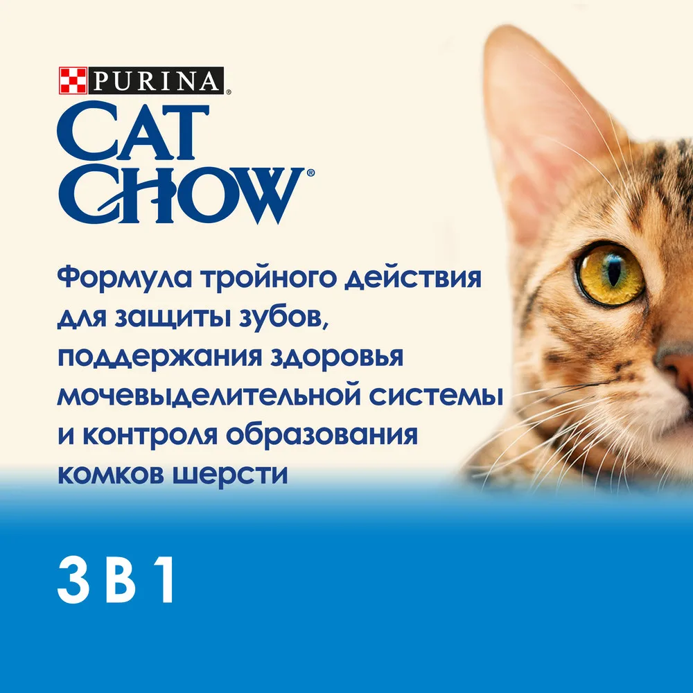 Чтобы жизнь Вашего питомца была долгой, здоровой и активной, корм для взрослых кошек должен работать сразу в нескольких направлениях.Сухие корма Cat Chow 3 в 1 – это рацион с высоким содержанием белка и уникальной формулой тройного действия. Она позволяет значительно снизить образование зубного камня, контролирует выведение комочков шерсти из организма и препятствует развитию мочекаменной болезни.• Сухой корм для кошек Cat Chow 3 в 1 полнорационный, содержит все необходимые для здоровья микронутриенты.• Баланс витаминов и минеральных веществ поддерживает здоровье мочевыделительной системы• Повышенное содержание клетчатки помогает контролировать образование комков шерсти в желудочно-кишечном тракте• Благодаря текстуре гранул сухой корм помогает очищать зубы от бактериального налета• Более 50% белка в корме (от общего количества белка) составляет белок животного происхождения• В составе корма содержится цикорий - натуральный пребиотик, который способствует улучшению пищеварения.