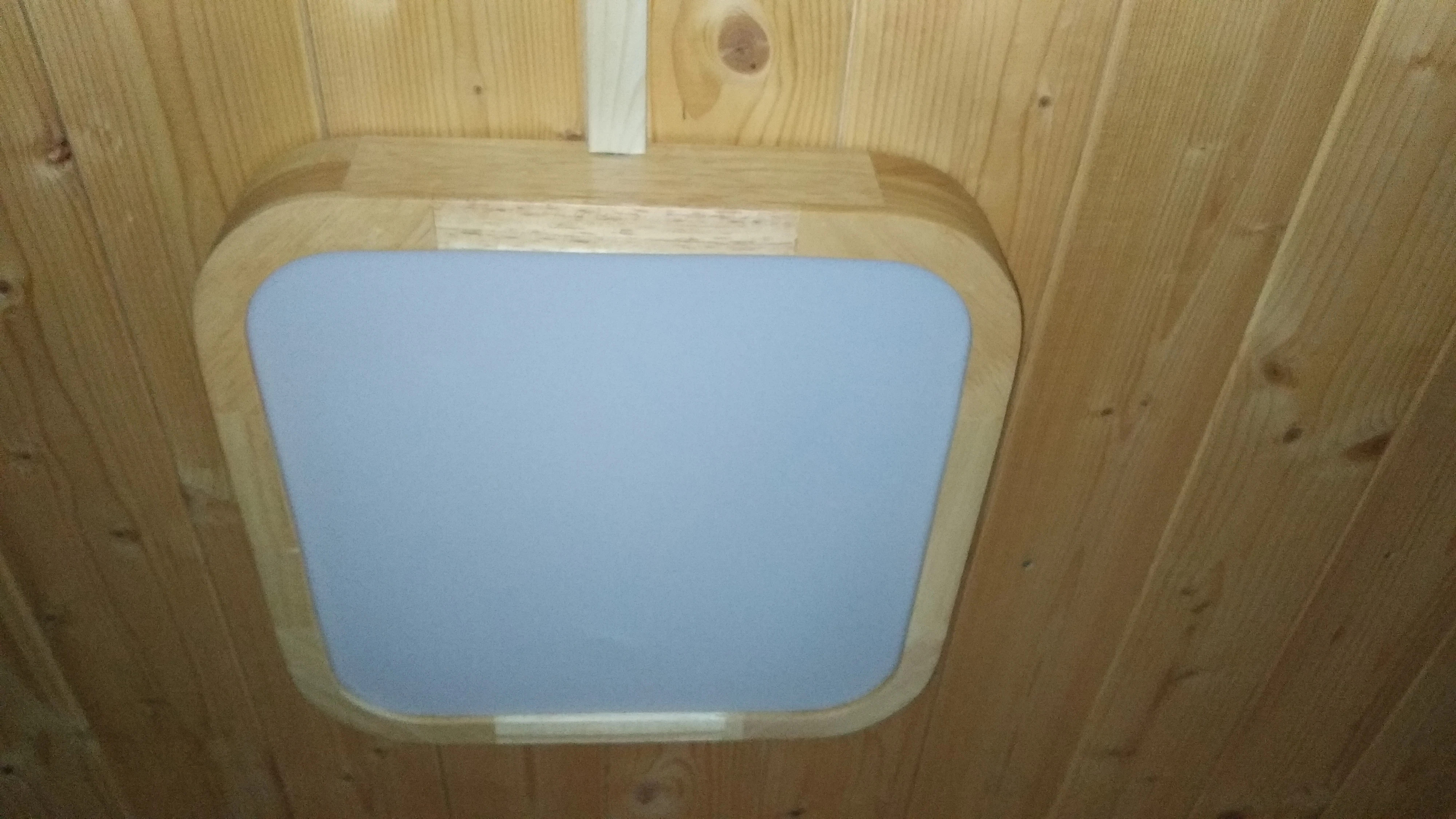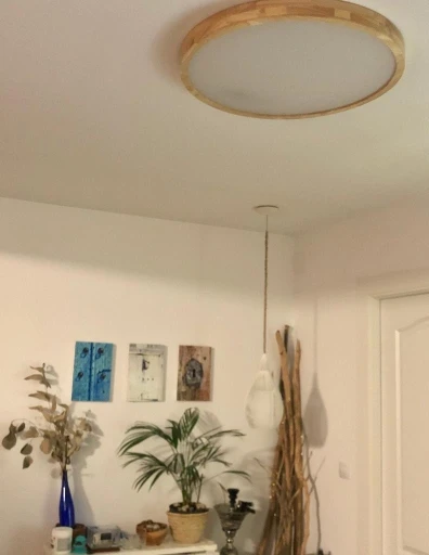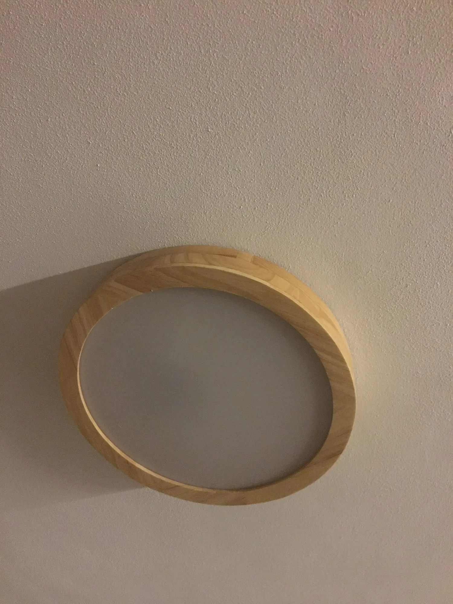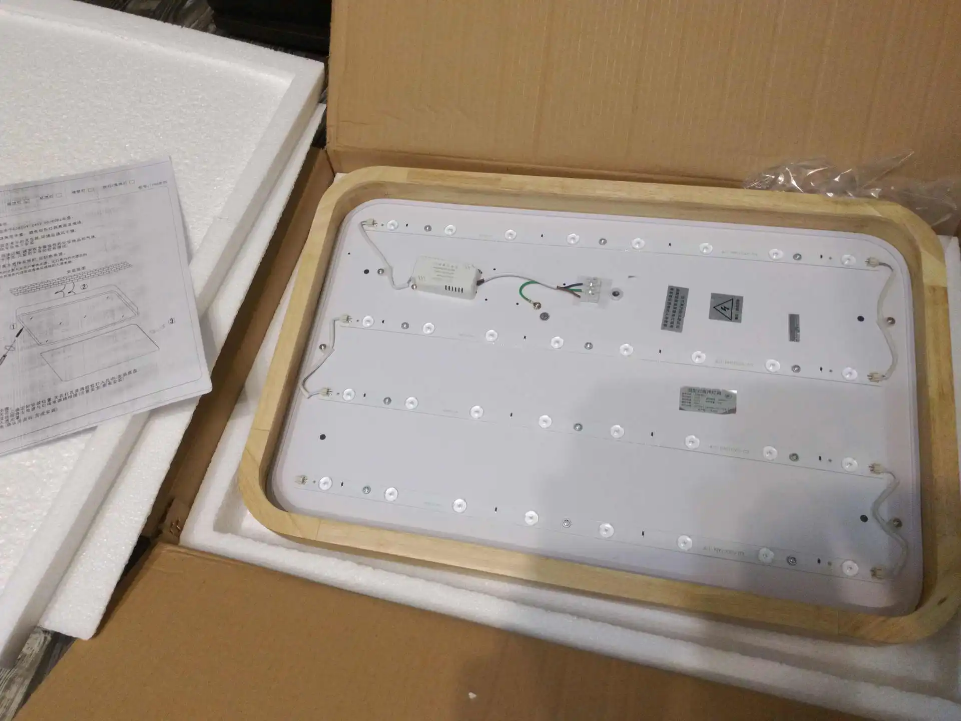 Доставка около полутора месяца. Светильник упакован здорово, все в пенопласте. Корпус по бокам реально деревянный, на фото видно. Конструкция очень жесткая, несмотря на такой большой размер. Повесил на два самореза по диагонали и его не перекашивает. Нагрев при работе практически не ощущается, площадь рассеивания тепла большая. Яркости у меня в прихожей даже много получилось. Мощность в описании завышена, реально около 33 ватт потребляет.