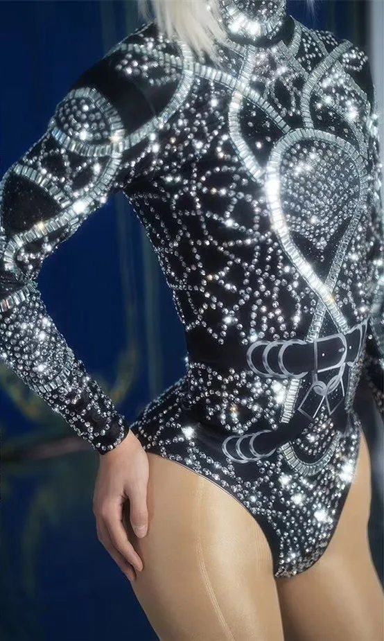 Серебристый, черный, стразы, боди с длинным рукавом, бар, DJ, певец, джаз, танцевальная команда, DS, костюм для ночного клуба, женские кристаллы, эластичный купальник