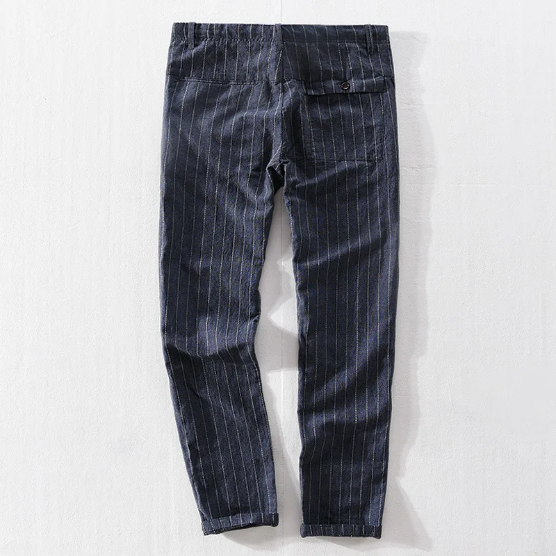 Мужские весенне-осенние брендовые винтажные полосатые прямые брюки из хлопка и льна в японском стиле, мужские повседневные свободные тонкие брюки