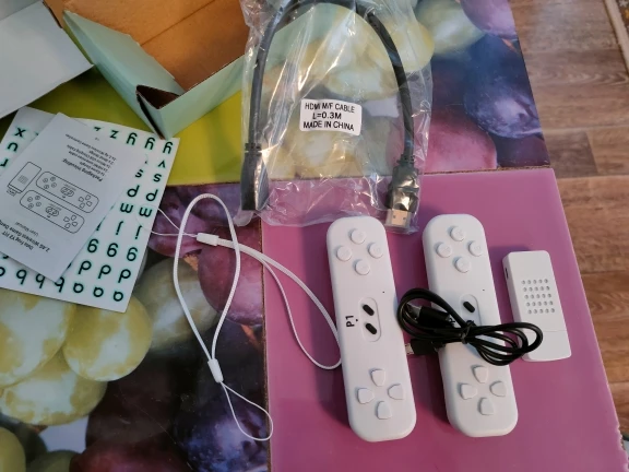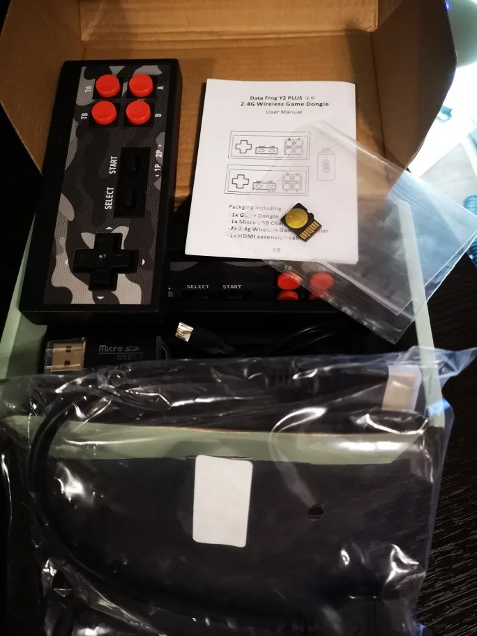Заказал 12.11, получил 06.12. Коробка помята, но всё целое: фото прикладываю. Батареек в комплекте понятное дело не было. Полный комплект как и было заказано, через ПК посмотрел файлы на флешках, игр даже больше чем анонсировано, но это ещё посмотрим, возможно будет один мусор. Что понравилось, так это джойстики, есть на них переключатели, какой будет первым, какой вторым, хотя опять же не было написано. Пока не включал, сейчас будем тестировать. Позже дополню отзыв.