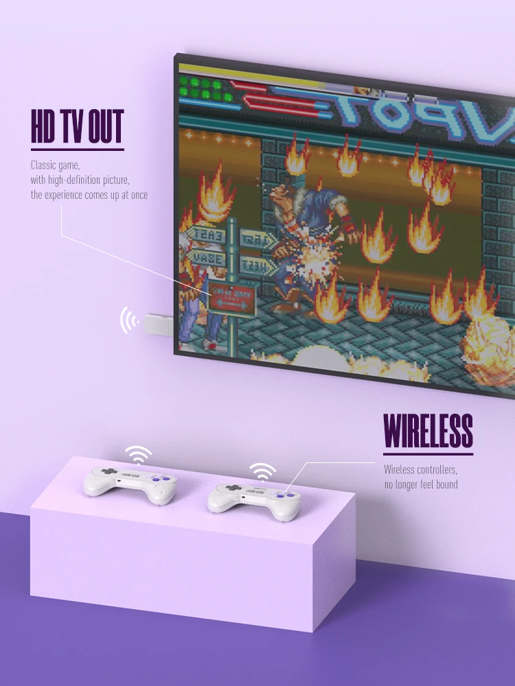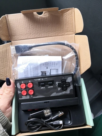 взял приставку в подарок на нг. во первых - исполнение - огонь , размером с флеху, игр много. второе - беспроводные джойстики очень удобные. сейчас телевизоры большие, и сидеть в метре от него - глаза будут как у ленивца из ледникового периода. вобщем приставка супер. есть пара незначительных недостатков: 1 стик сильно греется, можно решить доп вентиляцией корпуса. 2 джойстики немного тормозят, либо я отвык за много лет, возможно дело привычки. это все перекрывается ощущением ностальгии по 8 битным играм, которых очень много. из всех я знаю процентов 10. доставка в постамат.