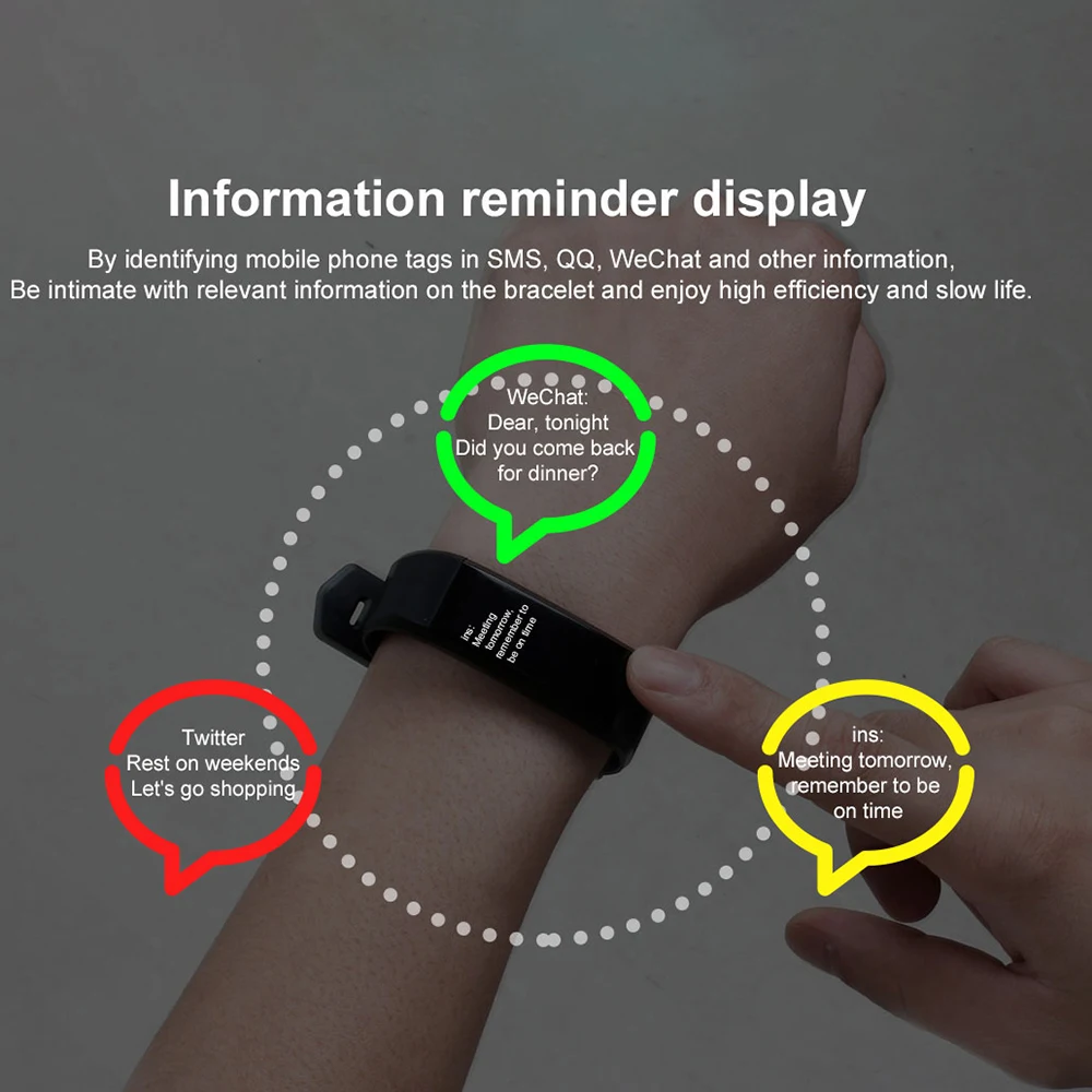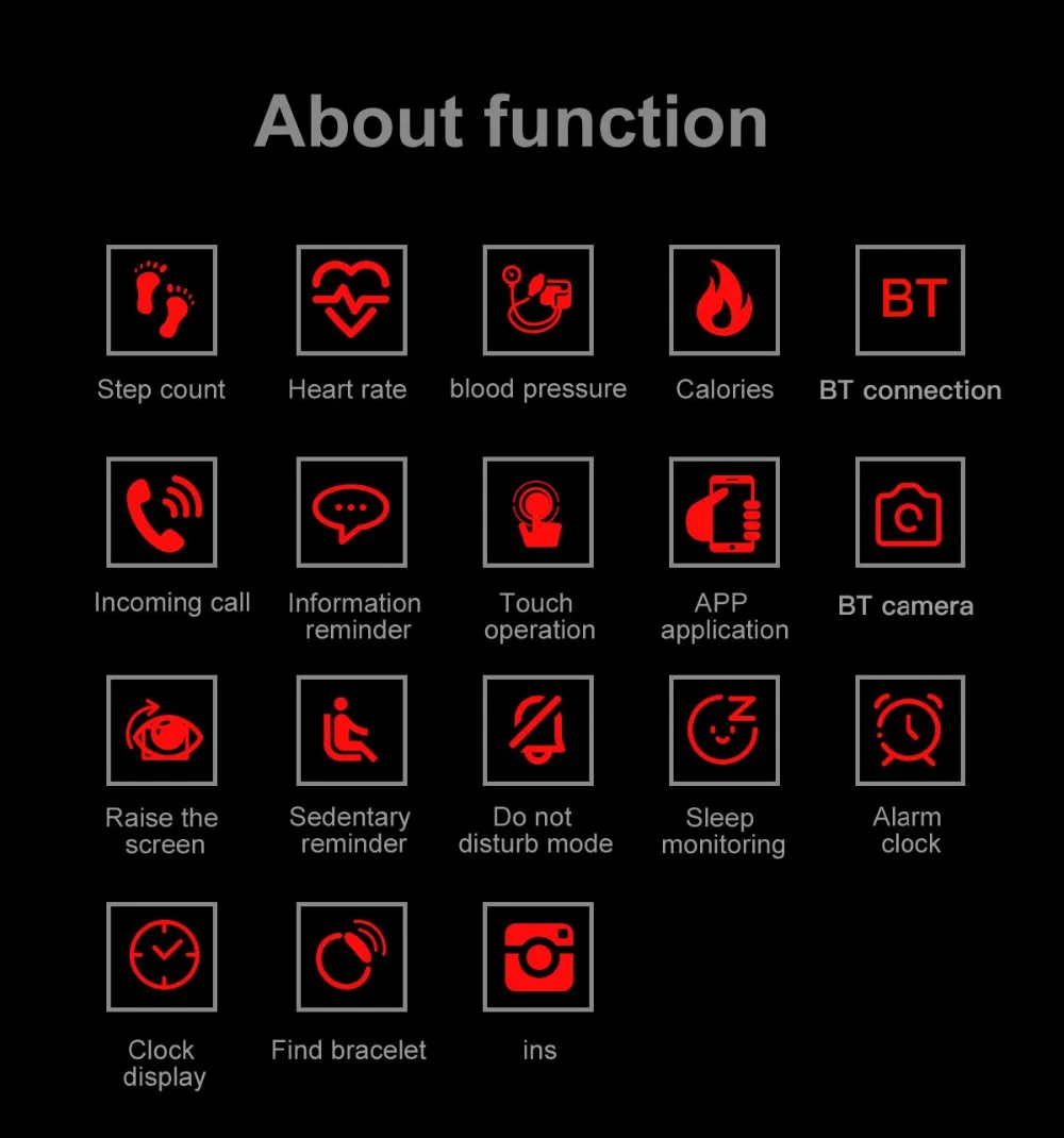 Функции: расстояние, сжигание калорий, шаги, время, подробные характеристики расстояния и количества сожженных калорий и качества сна, обмен данными о физических упражнениях и сне, уведомления и напоминания о push-сообщениях, защита от потери, напоминание о малоподвижности, будильник, найти браслет, встряхнуть, чтобы снимать удаленно, удаленный затвор, уведомления о звонках, кровяное давление, монитор сердечного ритма.