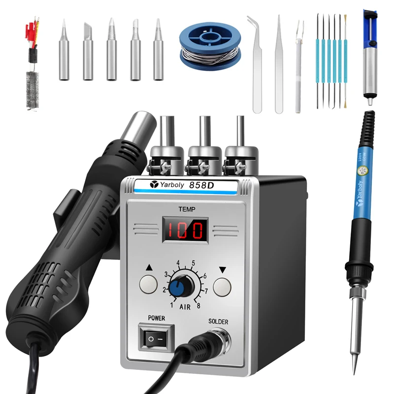 Модель: 858DТип: светодиодный цифровой дисплейПотребляемая мощность: 700 ВтВыходное напряжение: (24 В переменного тока)Диапазон температур: 100 °C-450 °CНагревательные компоненты: китайскийДлина ручки: 110 смРазмеры: 138 мм (В) * 10 мм (Ш) * 150 мм (Д)