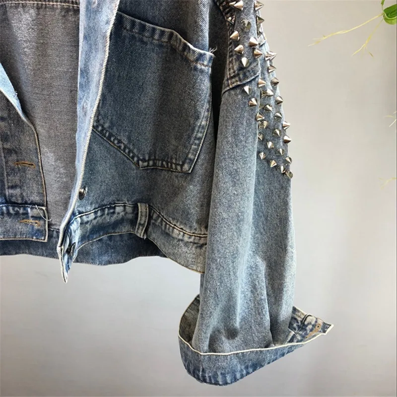 Куртка джинсовая женская, с заклепками, с длинным рукавом и карманами, весна-осень, 2019