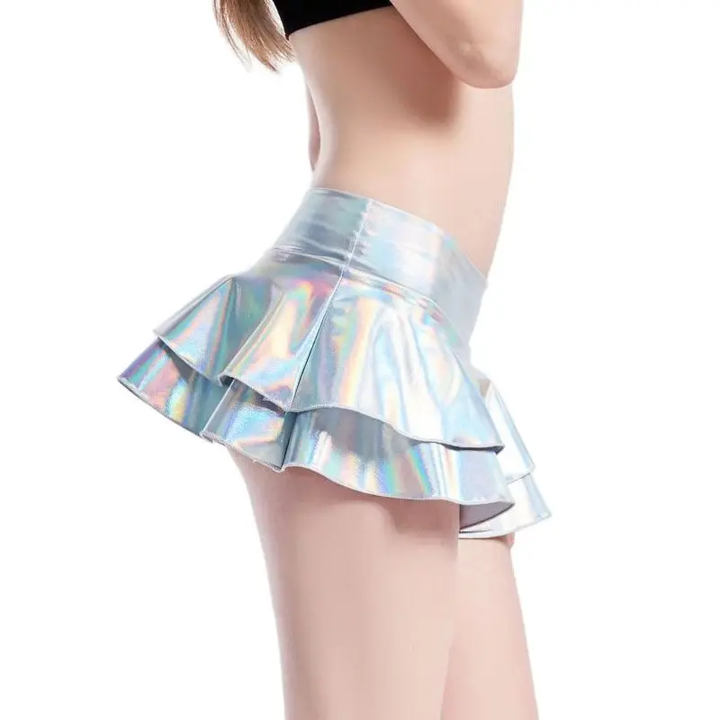 Женские летние сексуальные Клубные мини-юбки серебристого и золотистого цвета, короткие юбки из искусственной кожи, с низкой талией, плиссированные, трапециевидные