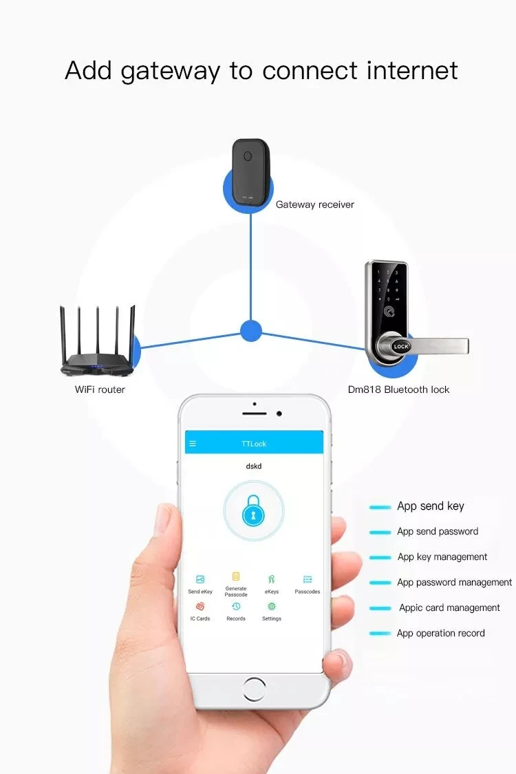 1. Доступ через приложение, карту M1, пароль, браслет и механический ключ. 2. Используется технология шифрования AES 128 бит. Отправьте Пароль/ekey удаленно, чтобы вы могли управлять входной дверью в любом месте. 3. Отправьте временный пассокод/ekey/карту своему гостю и тентентенту. По истечении времени ключ будет недействителен. 4. Просматривайте журналы доступа в приложении, чтобы вы могли контролировать свою входную дверь в любое время. 5. Поддержка мобильной системы Android 4,3/IOS 7,0 и выше. 6. Поддержка шлюза для подключения домашней Wi-Fi сети к блокировке. Таким образом, вы можете открыть дверь удаленно. (Пожалуйста, обратите внимание, что без нашего шлюза Функция Wi-Fi не может работать.) С помощью этого шлюза вы можете управлять блокировкой bluetooth даже на большом расстоянии. Измените или удалите ekey/пароль, который вы создали в любом месте в любое время. Мгновенно просматривайте записи открывания дверей Откройте дверь через приложение на большом расстоянии.