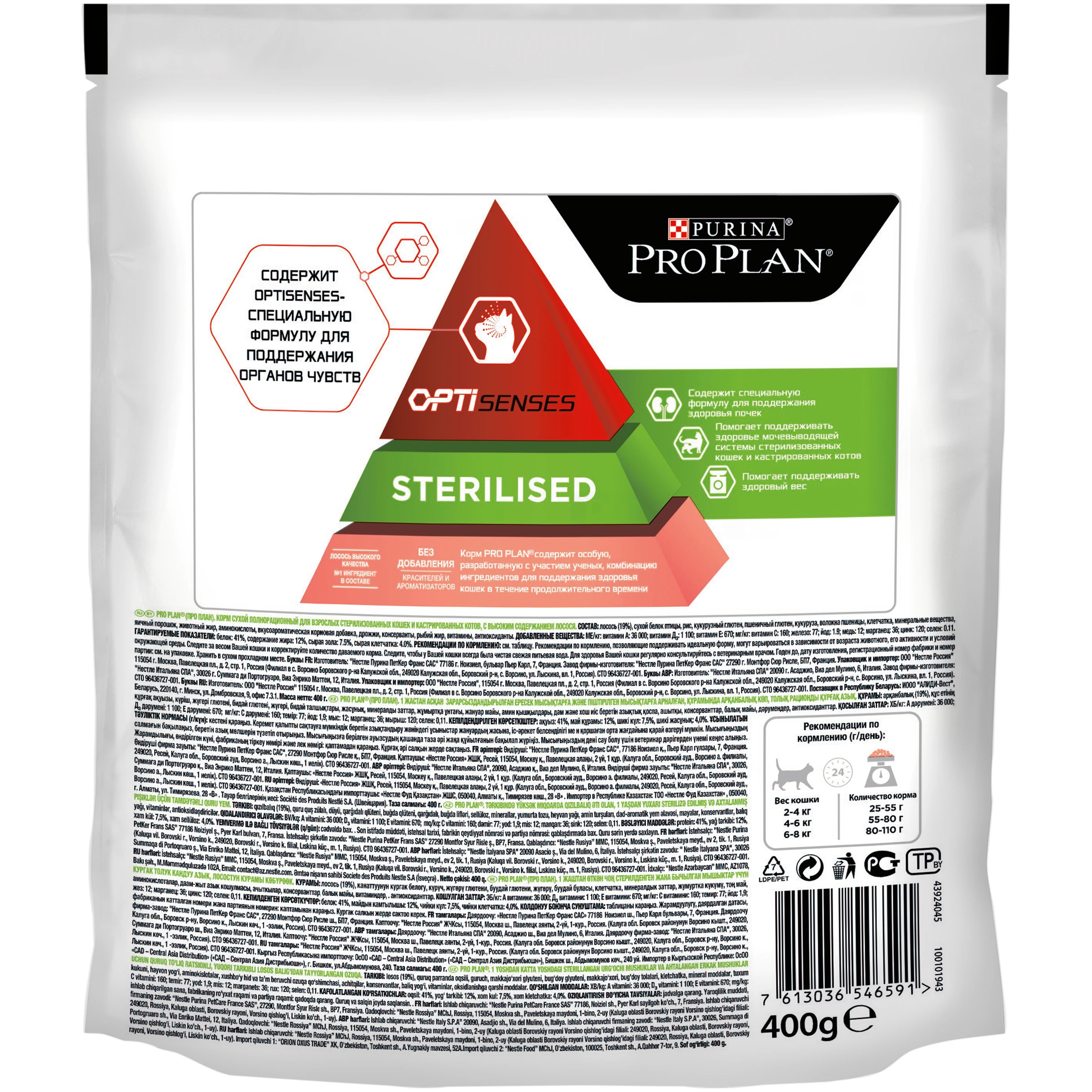 Сухой корм Purina Pro Plan для стерилизованных кошек и кастрированных котов (для поддержания органов чувств), с лососем, Пакет, 400 г