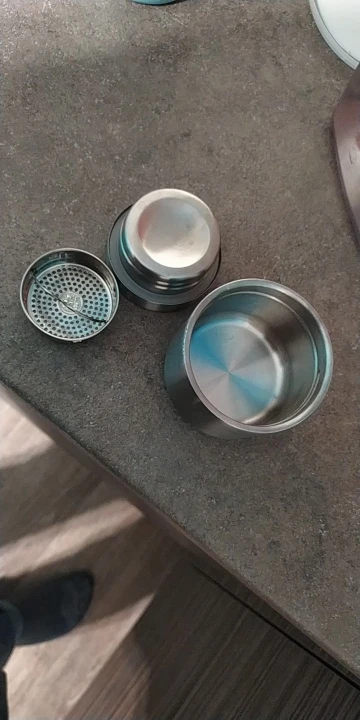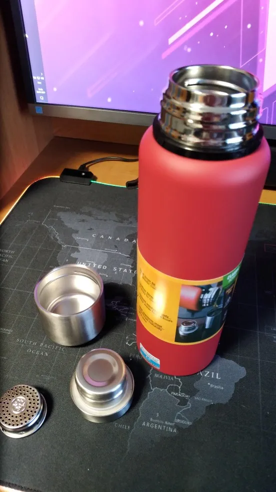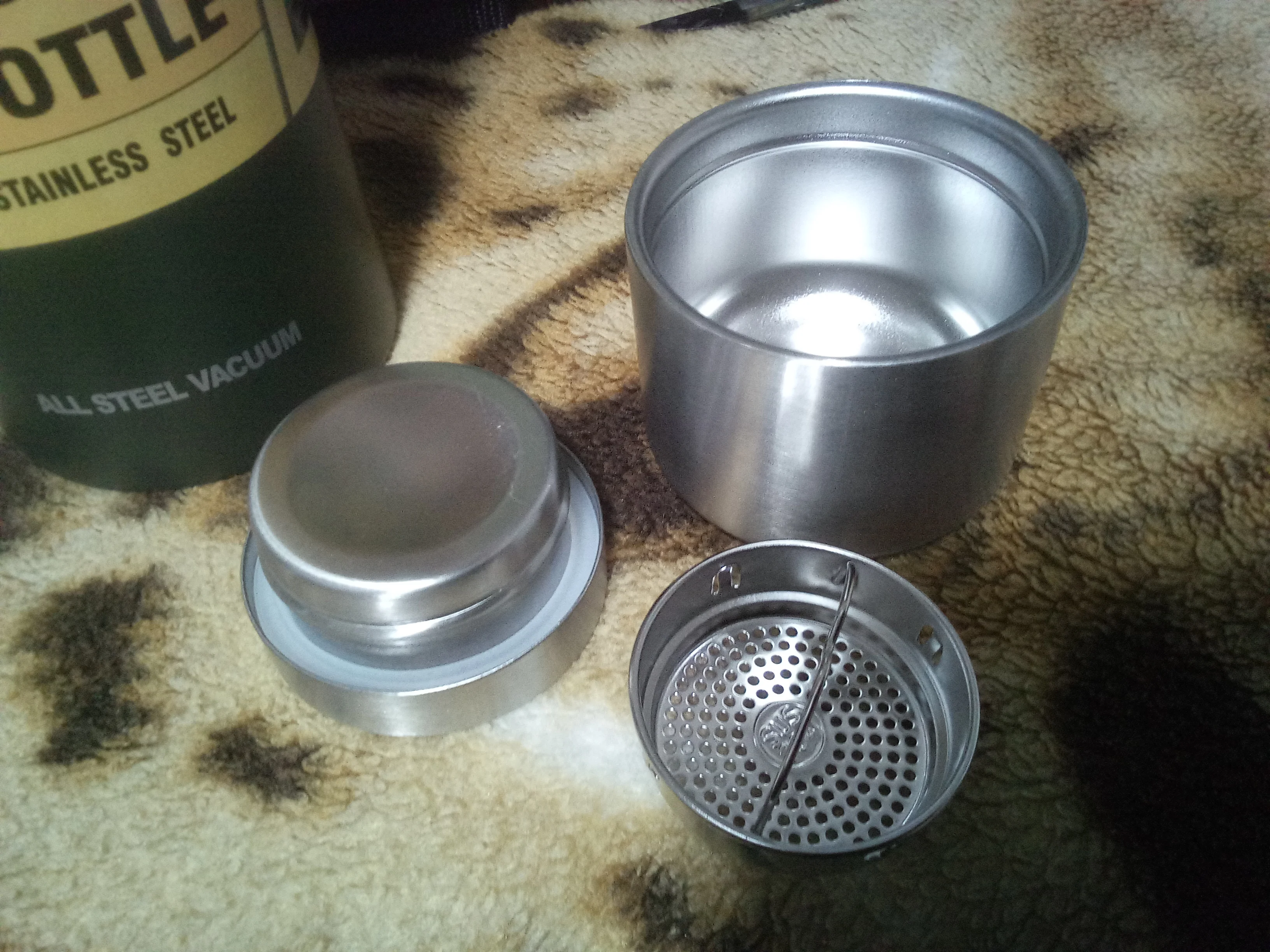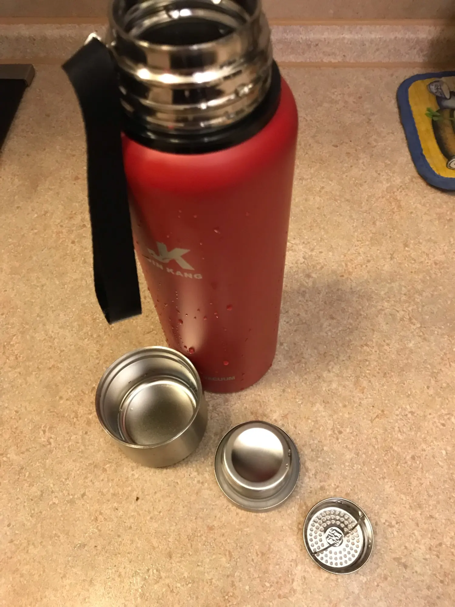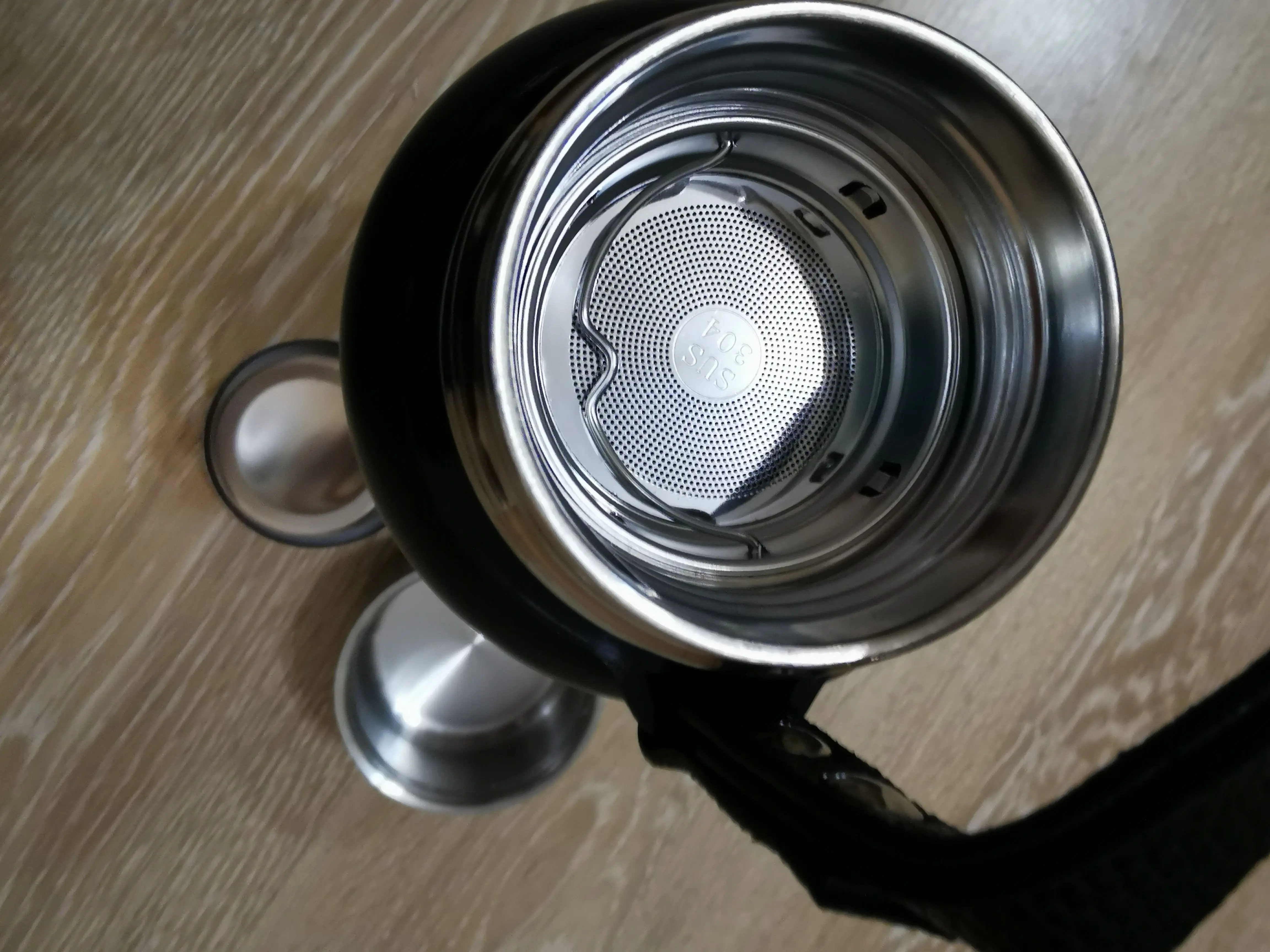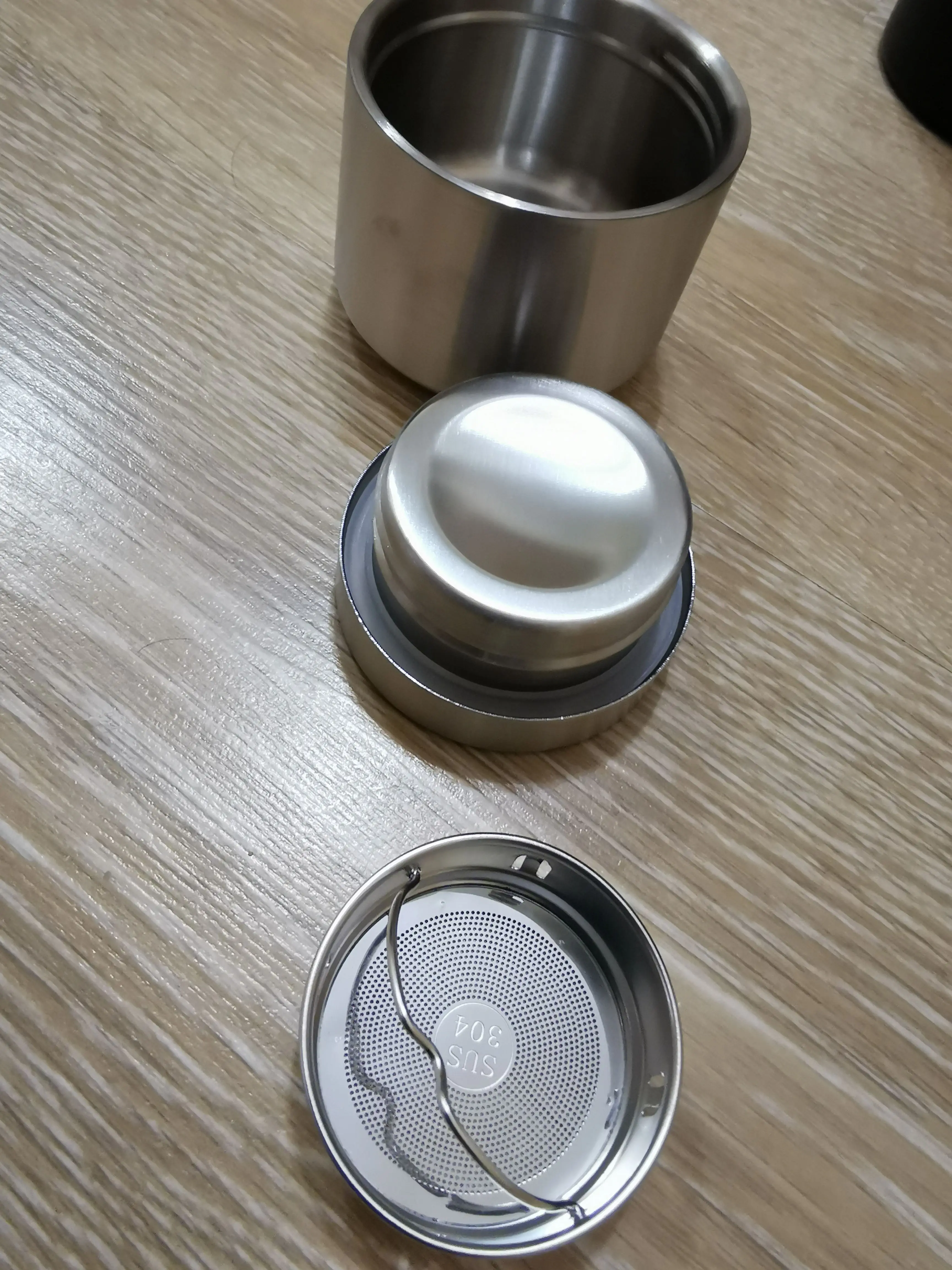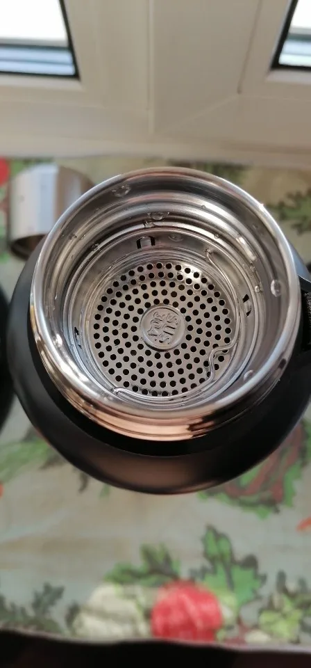 Выглядит неплохо, доехал относительно быстро. Главный минус это пробка. Через пробку большие теплопотери, сильно греется. Тем не менее кипяток за сутки остывает на 43 градуса при комнатной температуре. с 98 до 55. Ситечко чтобы заварка не попадала в чашку очень удобно.