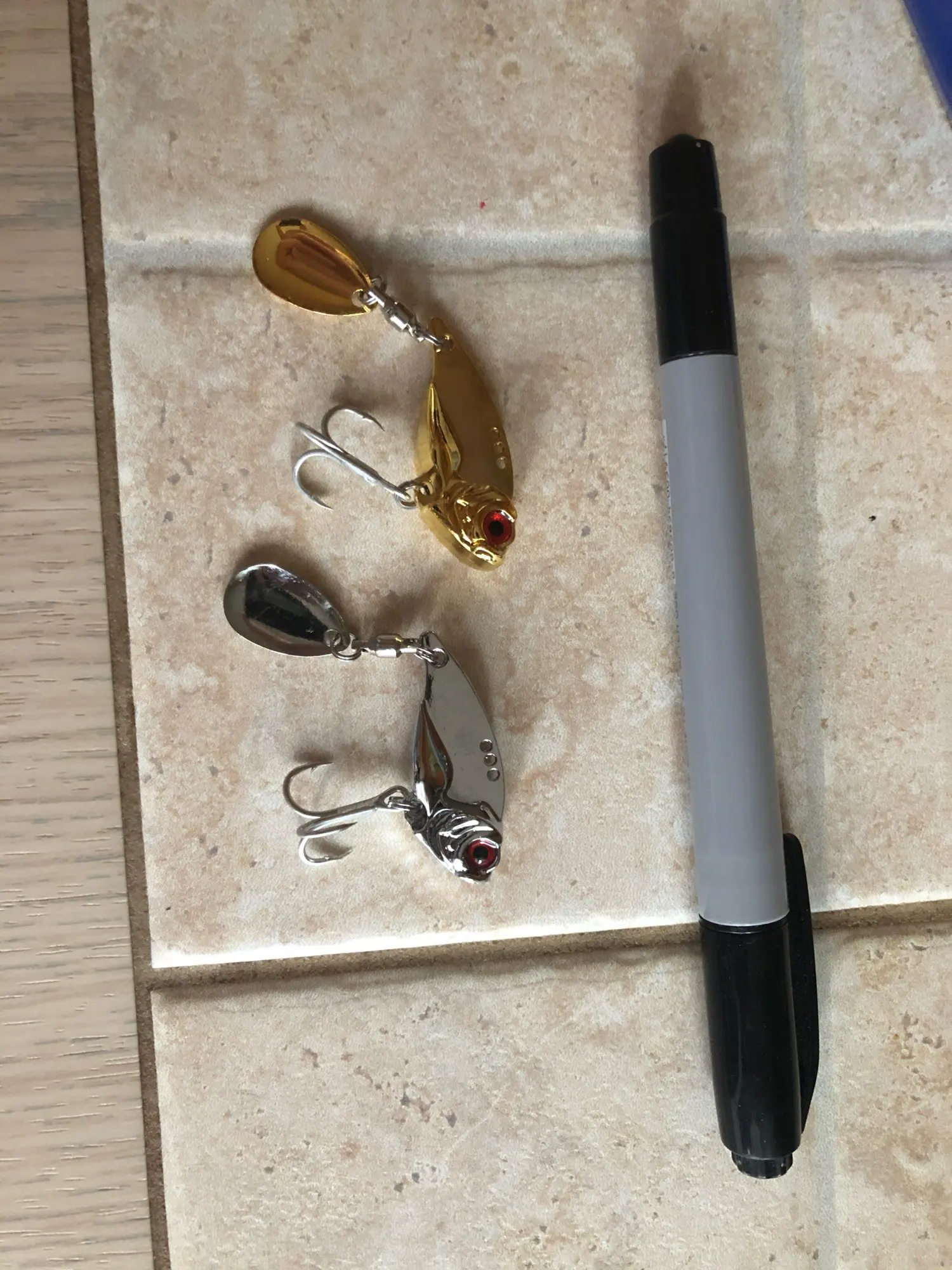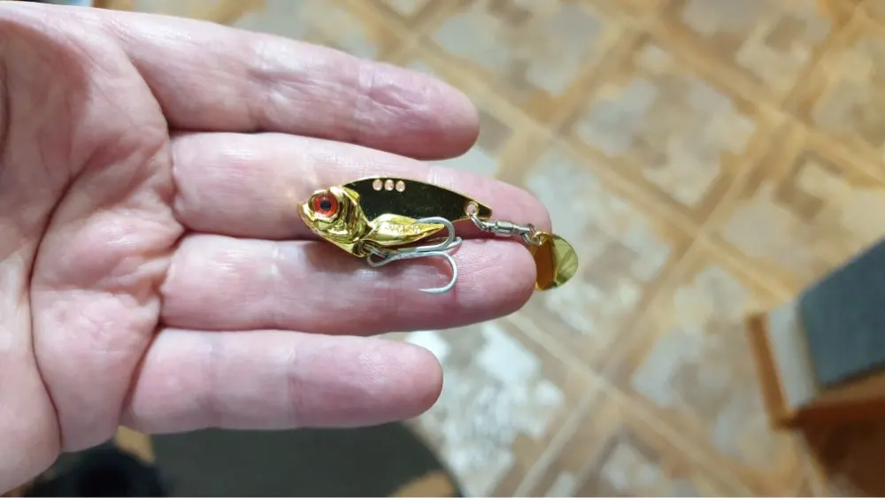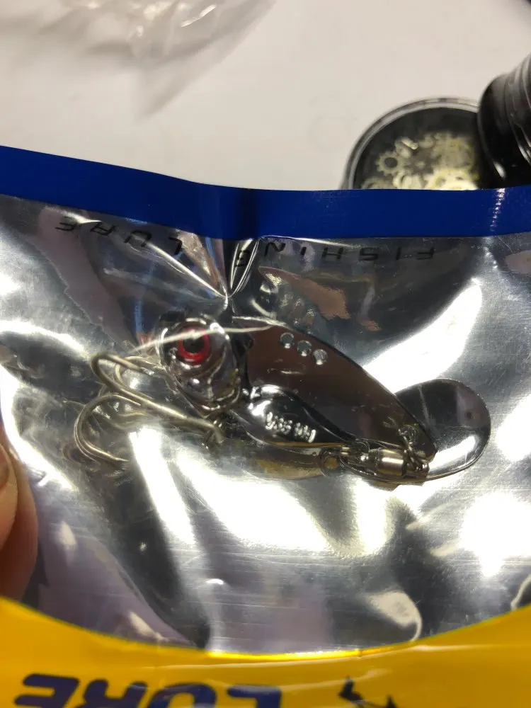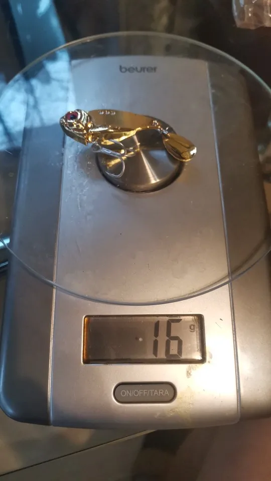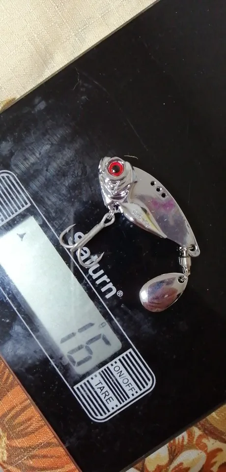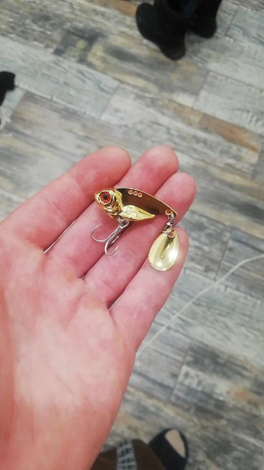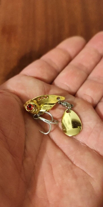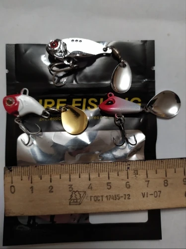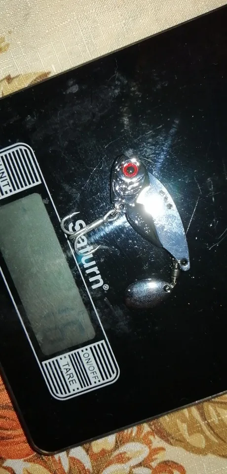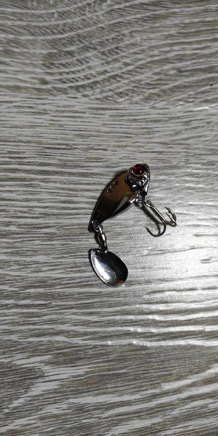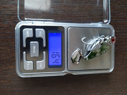 Точный вес 6.08г. Тройник острый но я переставил немного поменьше. Лепесток магнитится ,форма рыбки довольно странная, длина тела рыбки 25мм. Отверстие под лепесток далековато от края рыбки и не даёт свободный ход заводному кольцу. Пока ясно одно с такой компактностью и весом лететь будет как пуля.