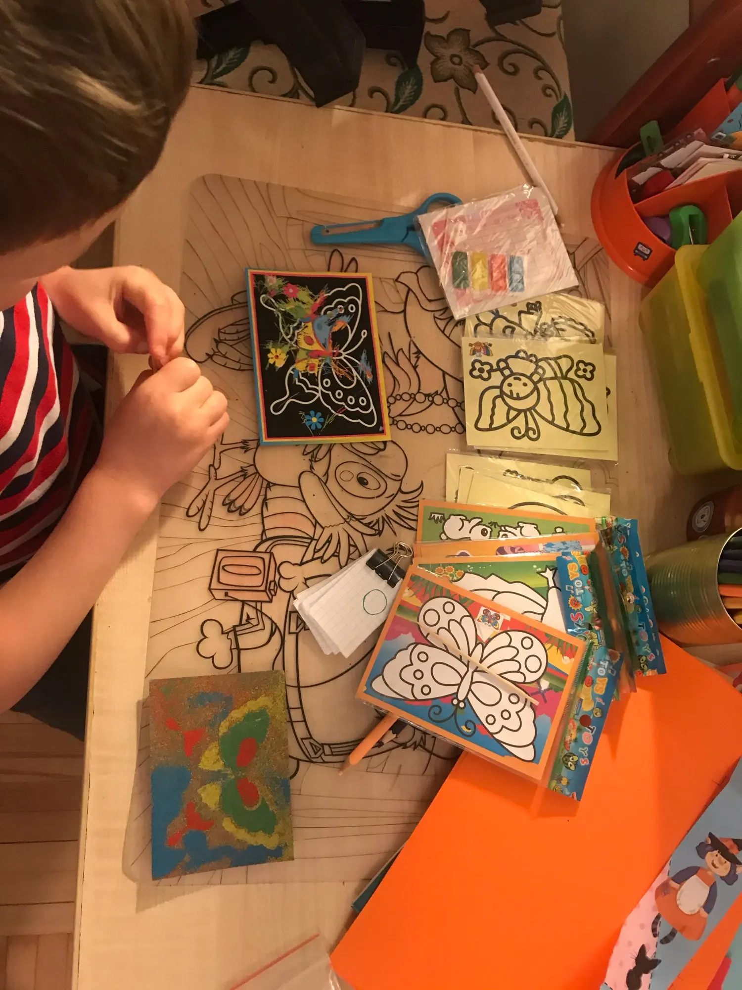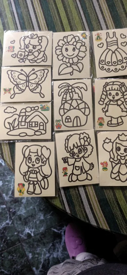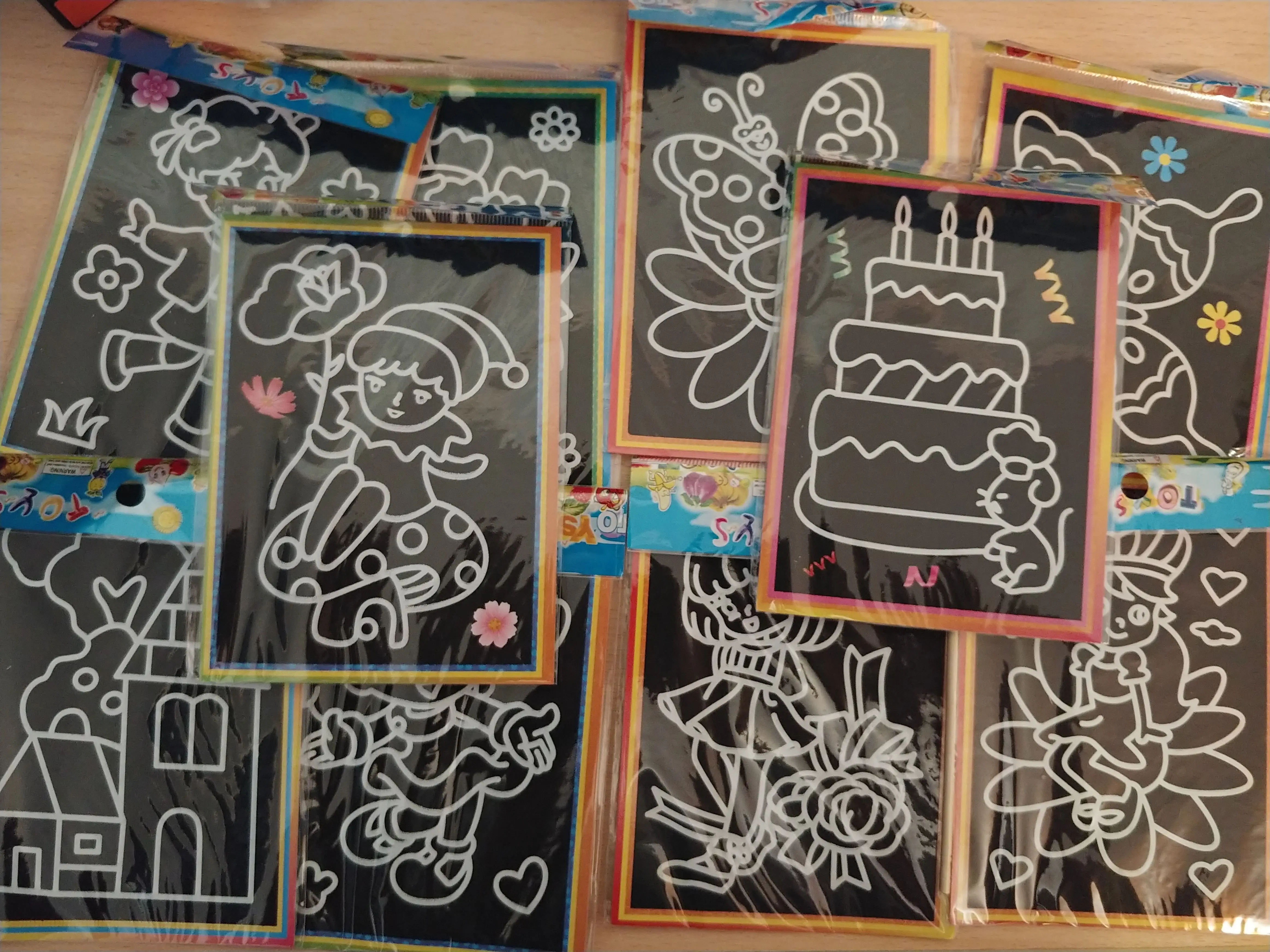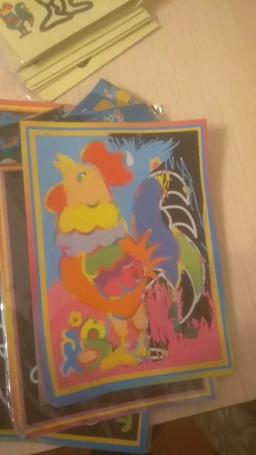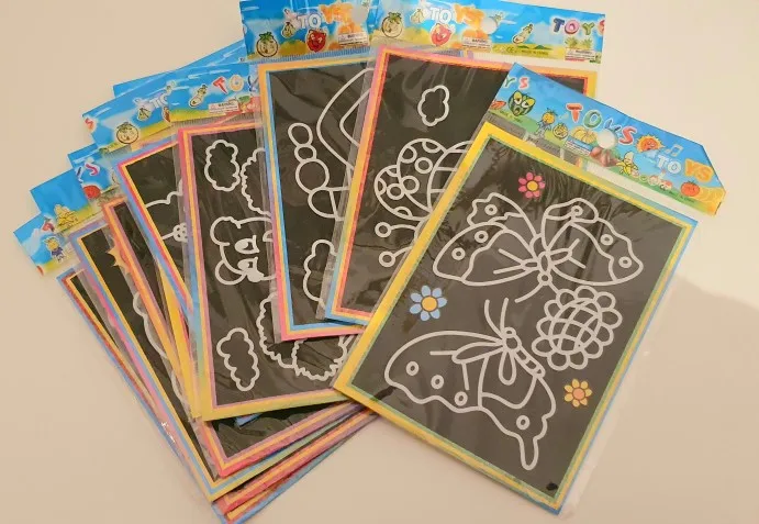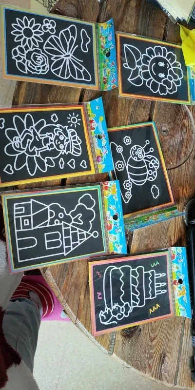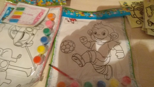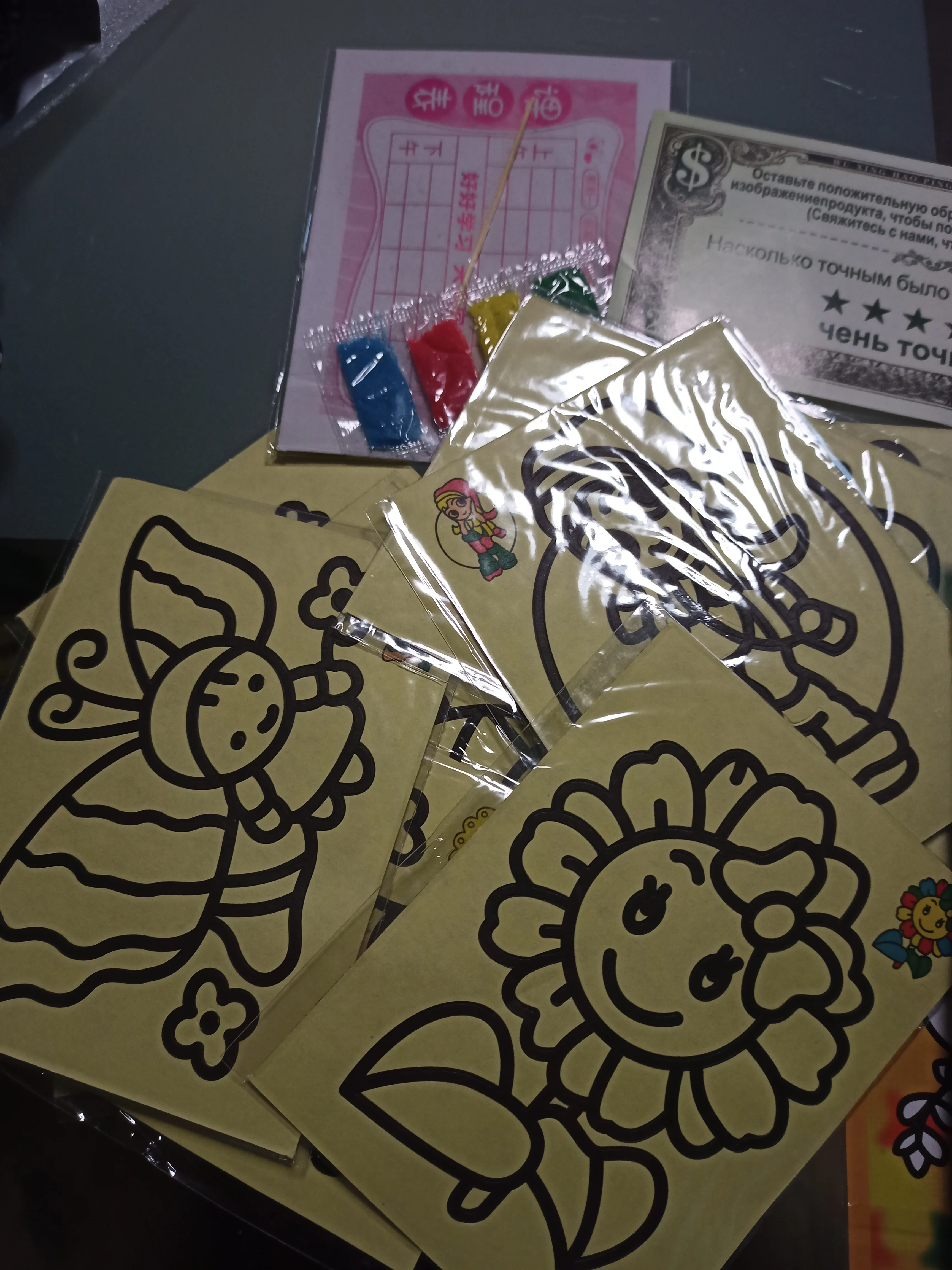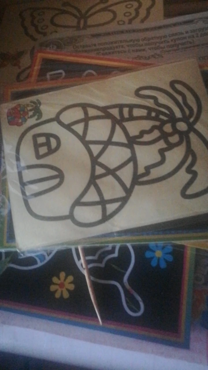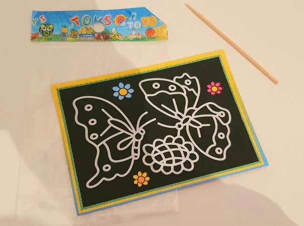рекомендую скретчи и рисунки песком для деток. отличный вариант для занятия дома. Рисуночки небольшого размера, но для деток - самое то. Быстро сделал один рисунок и доволен результатом. Песочек отлично прилипает в нужном месте, всё держится крепко. рисунки простые, но в маленьком возрасте сложные рисунки не нужны. Скретч рисунки так же отлично забавляют детей. Продавец молодец, товар отличный. рекомендую.