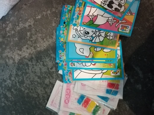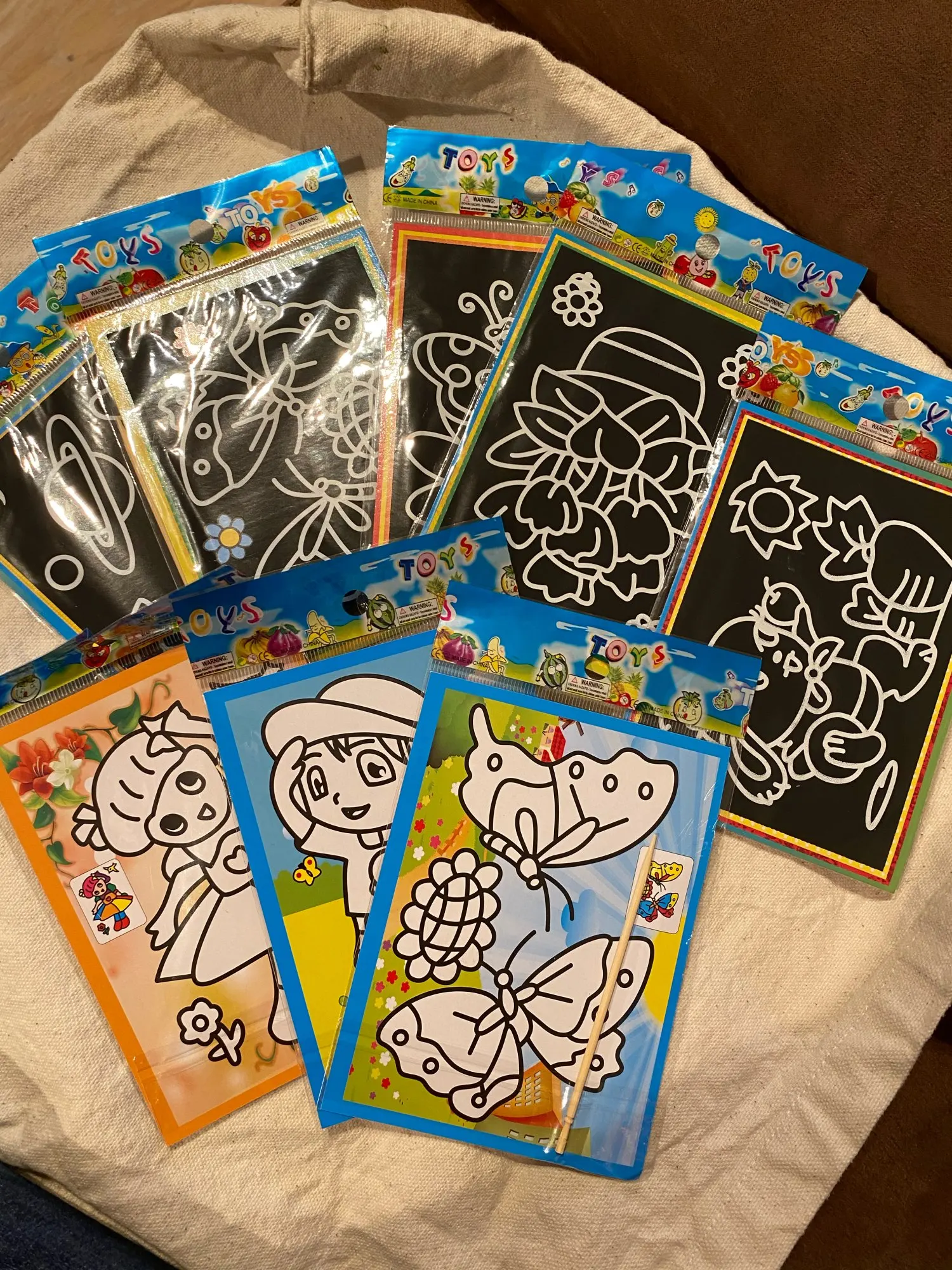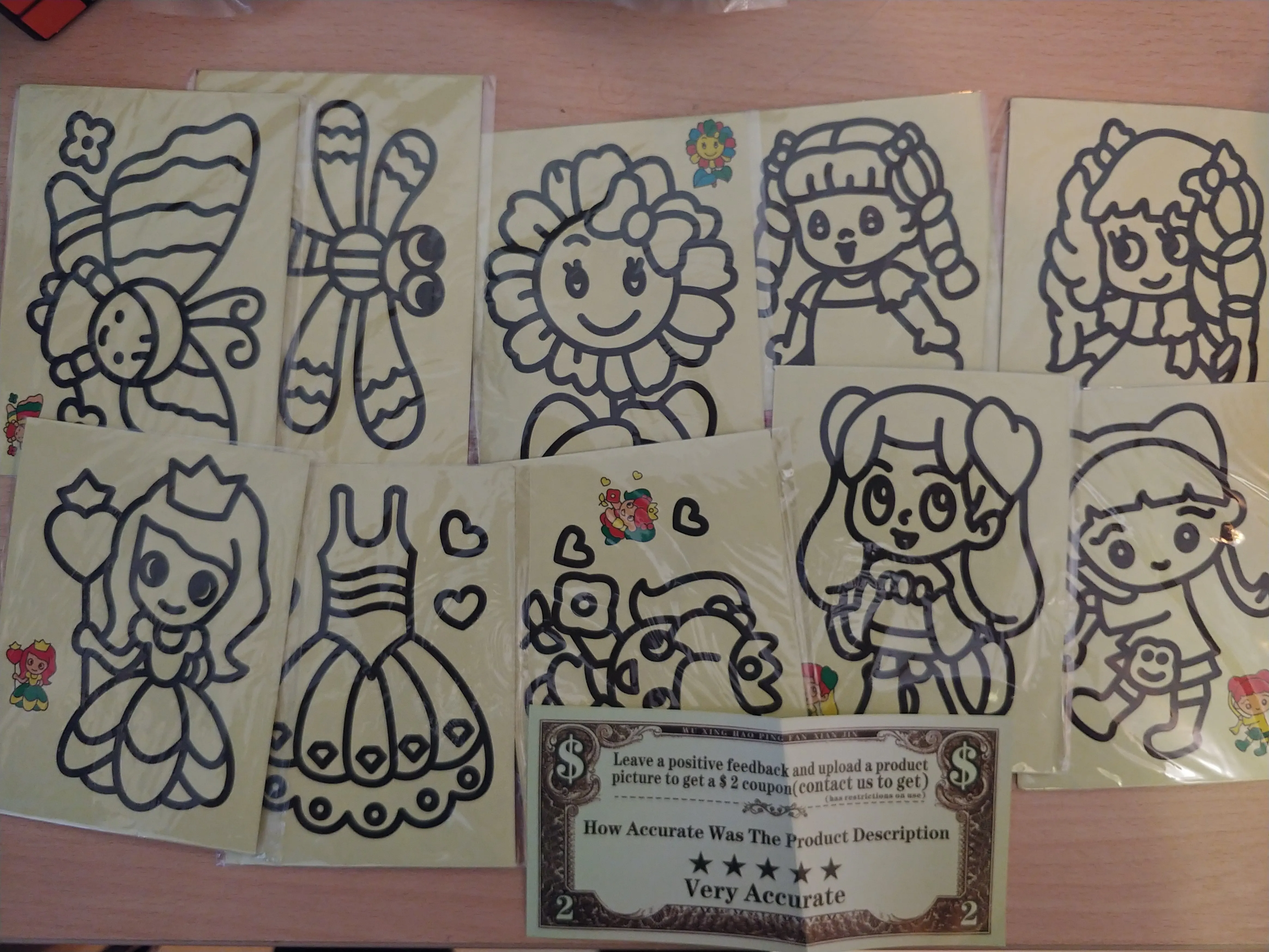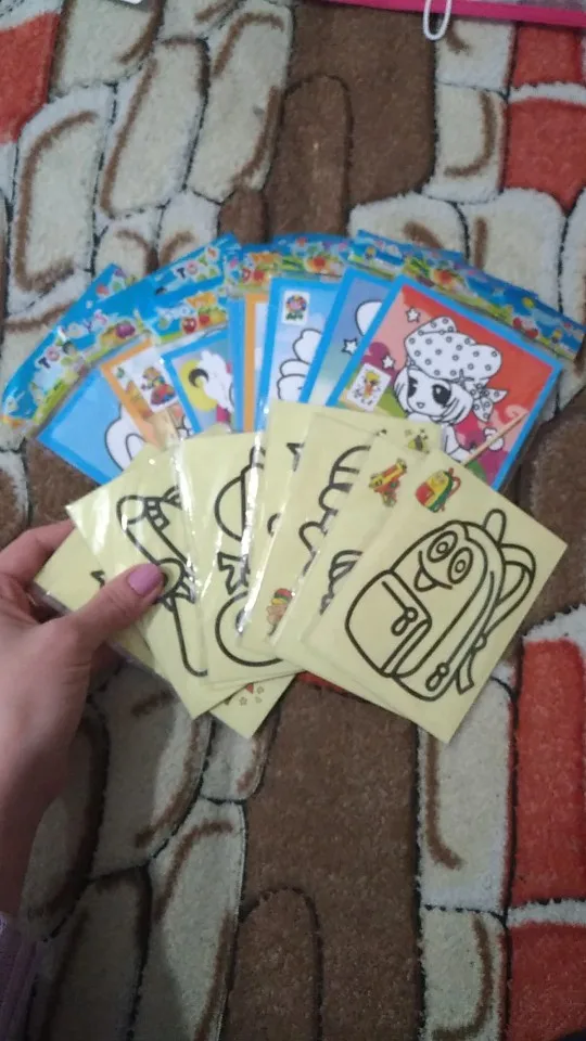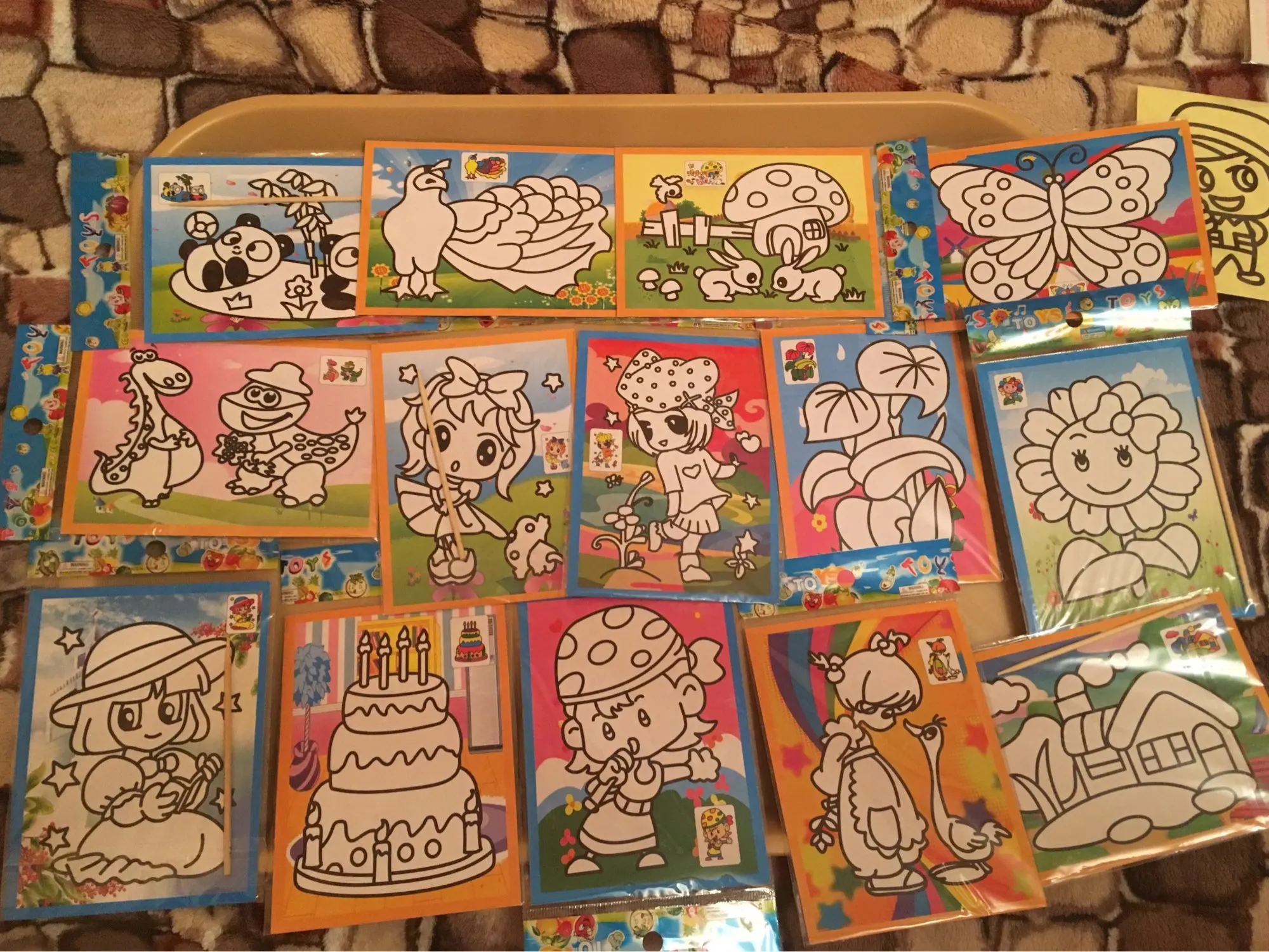 Заказ доехал примерно за 3 недели. В комплекте целая стопка различных картинок. Всего 3 типа: раскраски обычные, раскраски с цветным песком и картинки, которые нужно стирать, чтобы «открыть» рисунок. Ребёнок очень доволен. Большое спасибо.