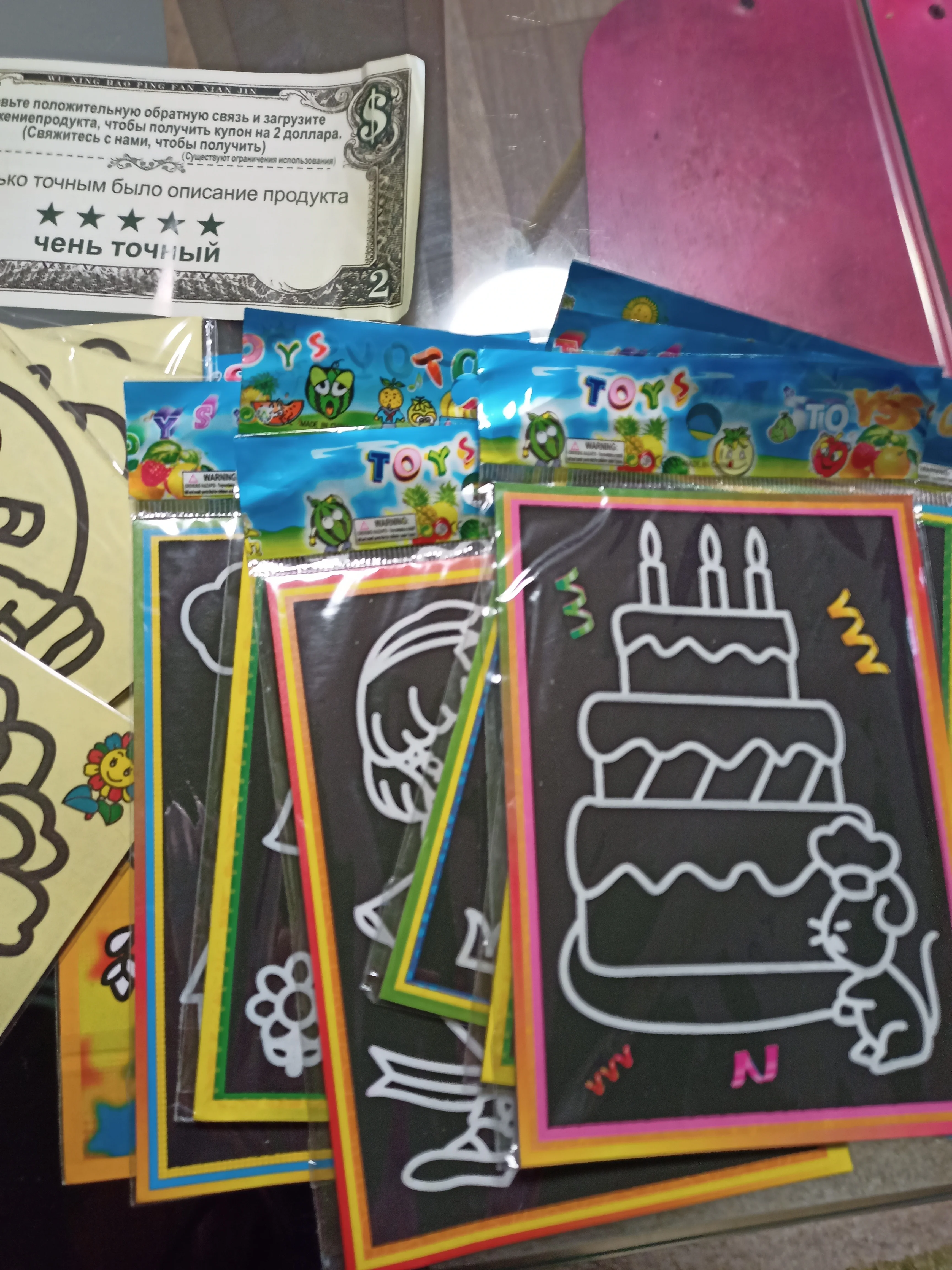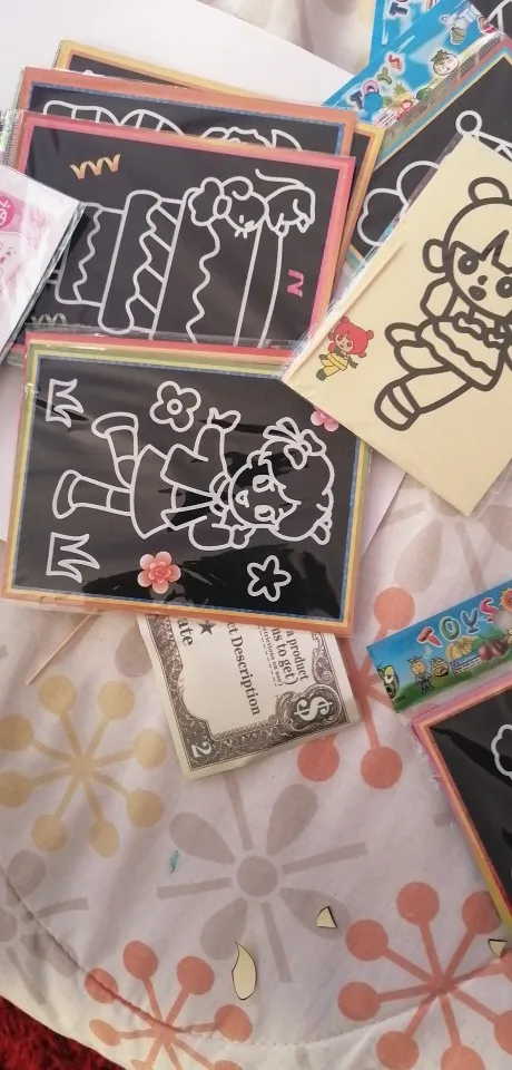 Мой ребенок очень доволен. Он потратил много времени на царапины этих карт. Они довольно маленькие, но идеально подходят для маленьких детей. Комплект выглядит точно так же, как в описании, и доставка была в течение месяца.