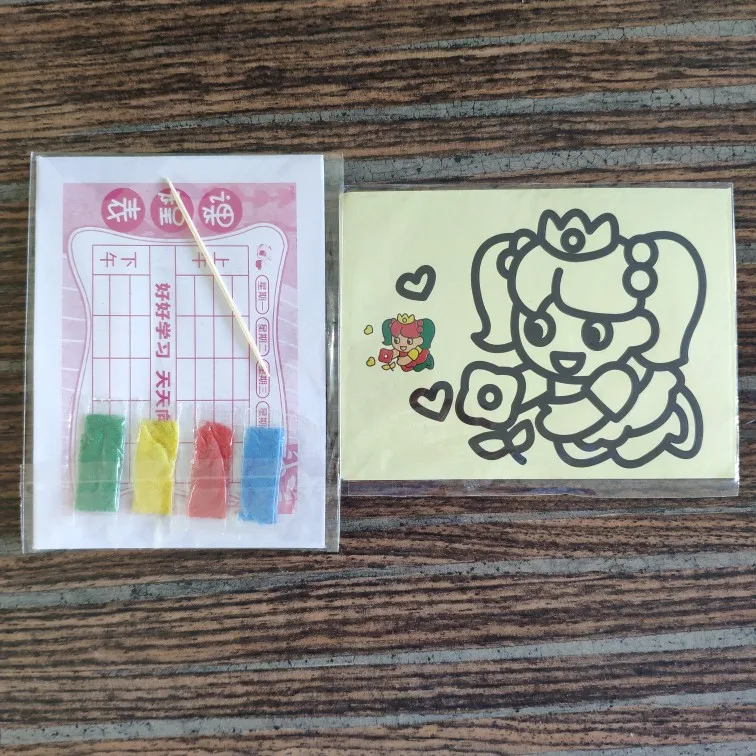 Заказ приняли и отправили быстро, заказала 24.11, забрала 17.12. В наборе 10 картинок с песком и 10 с деревянной палочкой, как и было заявлено. Ребенку понравился набор, будет чем заниматься вечерами.