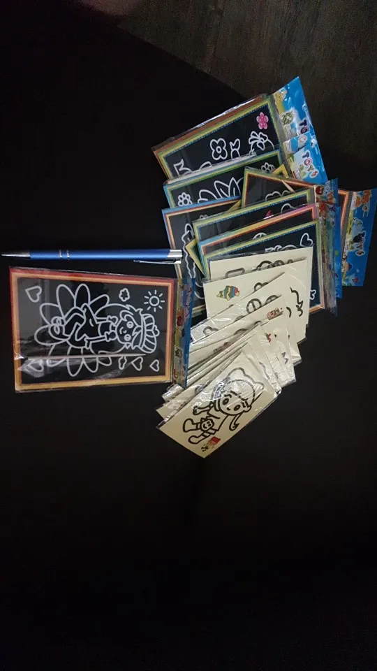 Небольшие карточки 11.5 см. 20шт клейкие, посыпать разноцветным песком, который идёт в комплекте. И 10 шт- деревянной палочкой сшкрябываешь чёрный слой и под ним цветная картинка. Заказывали в новогодних числах, то прислали не очень быстро. Но для меня это было не критично. Спасибо