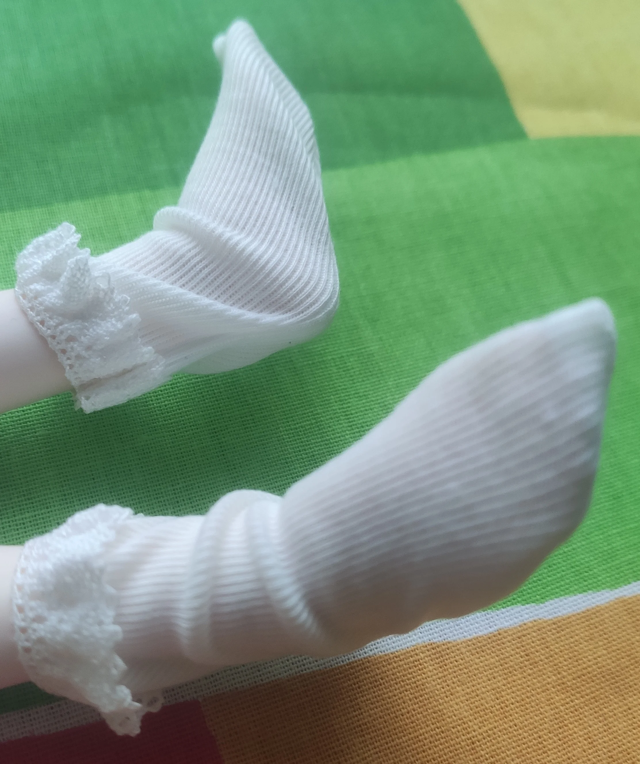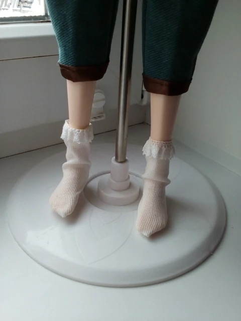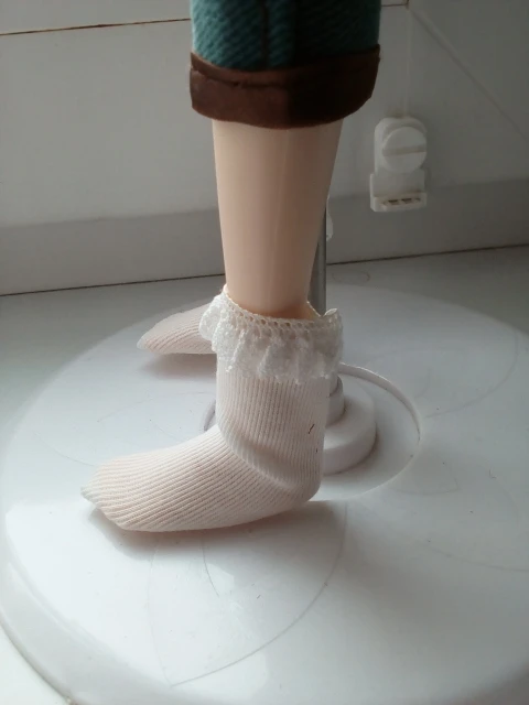 Получила носочки через полтора месяца, отслеживания не было. Описанию соответсвует, вот только на куколке bjd 1/4 мальчике смотрятся странно: у носка пошив ровный, т.е. без пятки и на плоской стопе... в общем сверху много складок, под стопой лишняя ткань... может с обувью уже нормально будет смотреться... К качеству нареканий нет