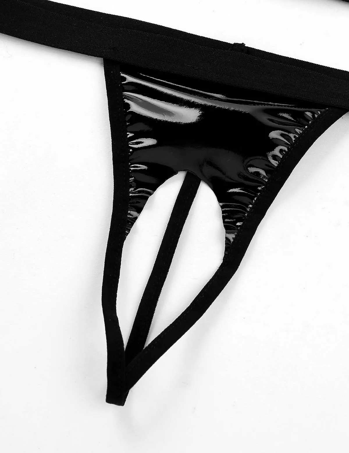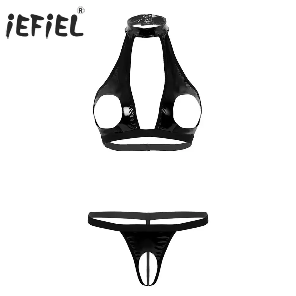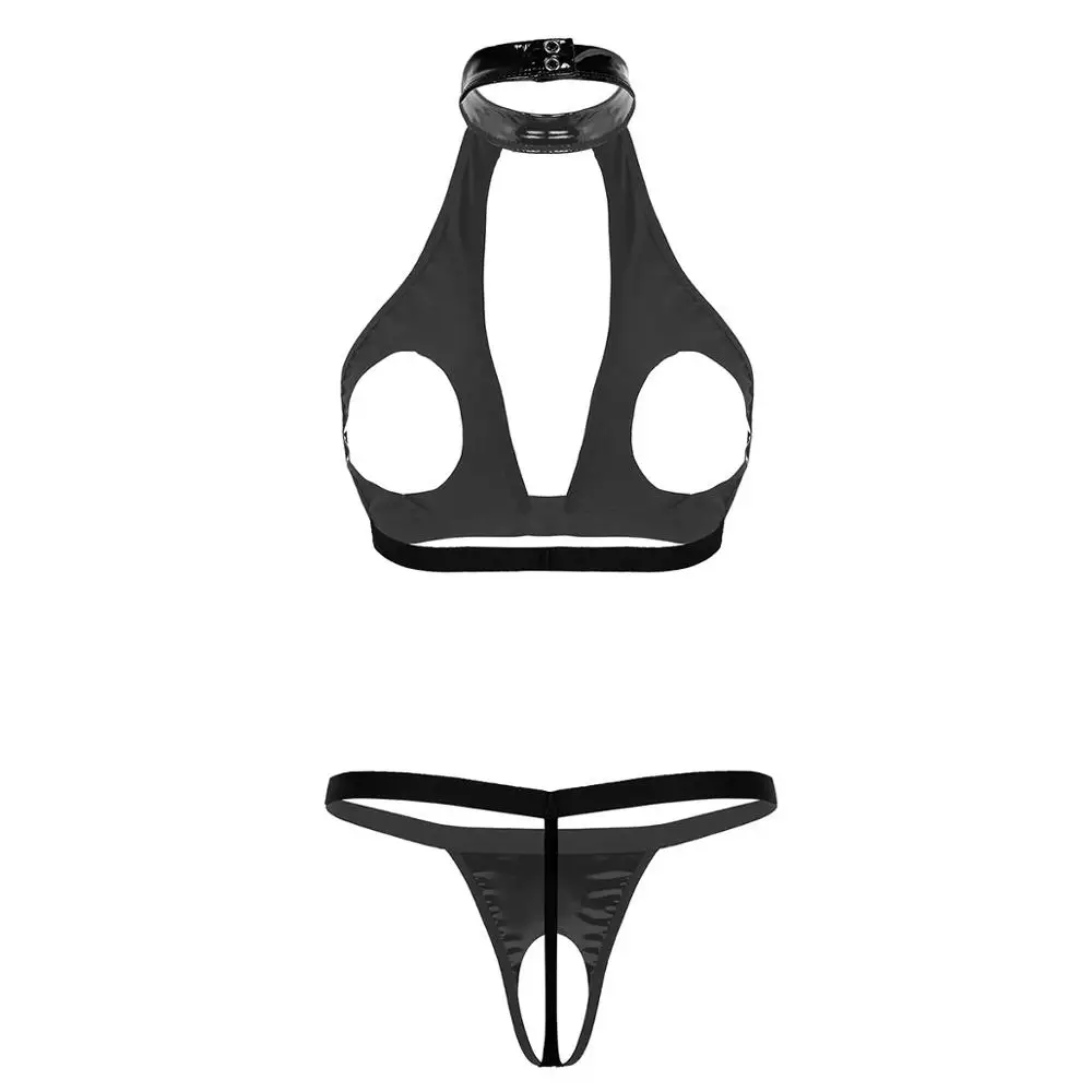 Комплект женского нижнего белья из искусственной кожи с вырезами и открытым бюстгальтером