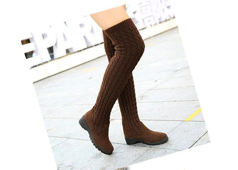 Женские сапоги, Осень-зима 2019, высокие сапоги до бедра для женщин, вязаные шерстяные длинные сапоги, женские коричневыечерные сапоги, женская обувь
