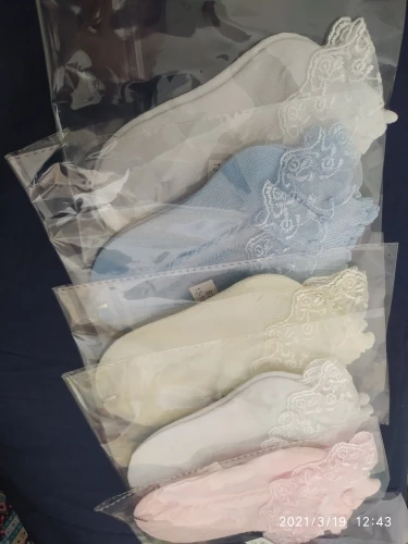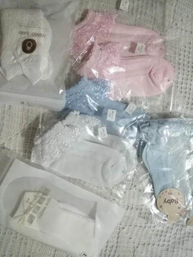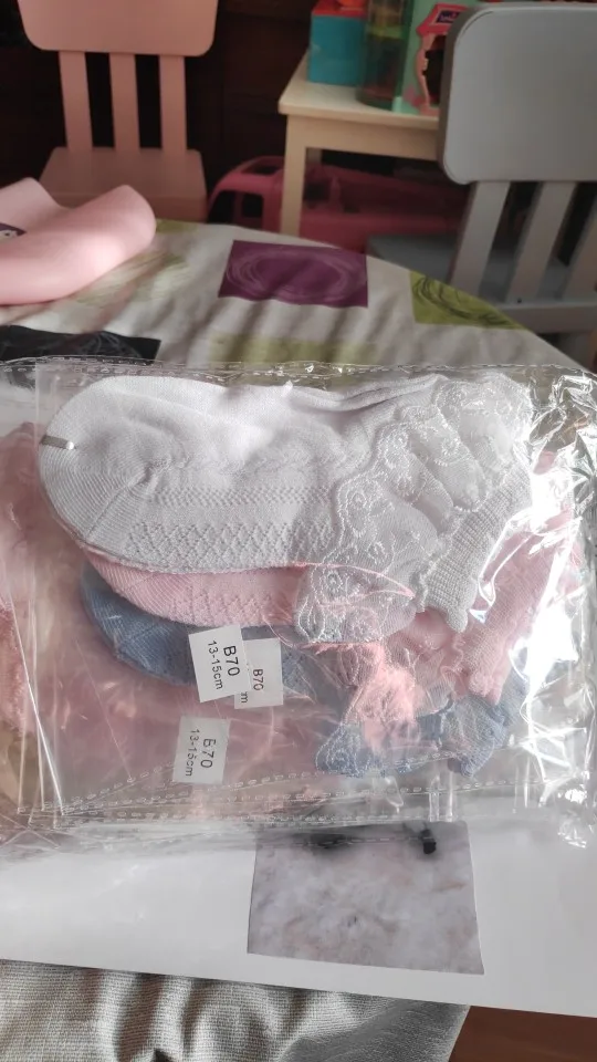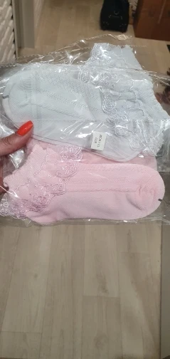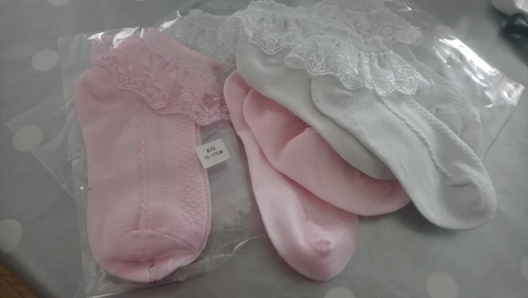 Носочки качественные. Хлопок. Попросила продавца положить 2 пары розовых, 1 белые, 1 голубые и 1 зелёные. Положил 3 розовых, по одному голубых и зеленых. Белых вообще не положил)