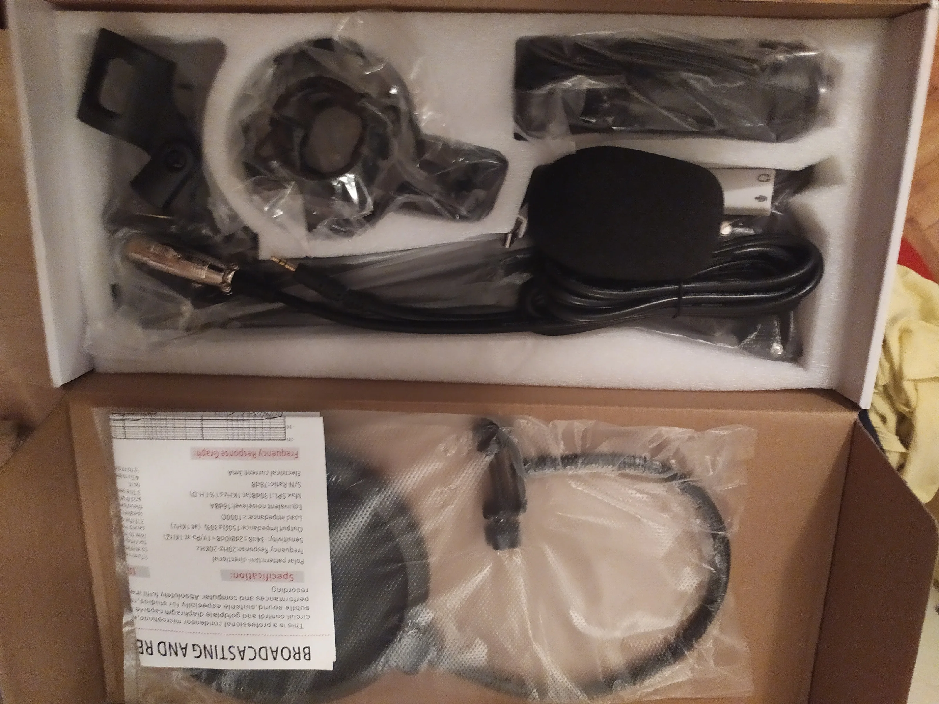 Микрофон неплохой. Доехал за 7 дней IML из Москвы. Без фантомного питания работает, но тихо, что логично. с фантомкой всё ок. Понравился кабель, с хорошим разъемом XLR, неплохой, хотя и пластиковый паук. А вот что было плохо, так это пайка внутри, на плате. Ужасные сопли, тонкие провода. SMD напаяны нормально, но флюс не смыт. Ну и поролоновый фуфырик, мятый, не знаю, разгладится или нет.