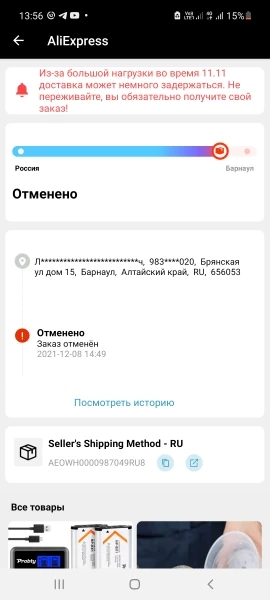 товар был утерян на каком то складе,но продавец сразу согласился вернуть деньги.