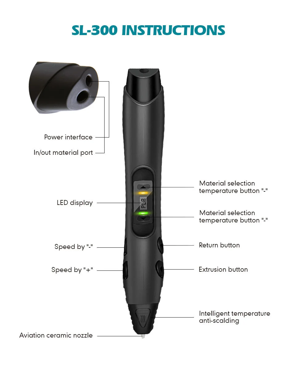 Название: SL-300AКоличество: 1 * ручка, 1 * руководство, 2 * нить, 2 * крышка пальца, 1 * USB кабельПрименимый материал: 1,75 мм PLA/ABS/PCLОптимальная температура: АБС 180-210 ℃PLA 160-180 ℃PCL 60-90 ℃Цвет: черный и белый, черный и серый,Черный и синий, черный и зеленыйВходная мощность: DC5V 2A 10WВход питания адаптера: AC100-240V50/60HZ 0.35AГарантия: один год