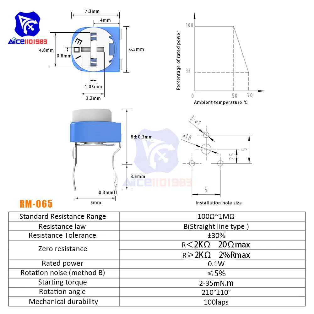 Подстроечный резистор RM065, 100R, 200R, 500R, 1K, 2K, 2,2 K, 3K, 5K, 10K, 20K, 50K, 100K, 500K, 1M Ом, RM-065, триммер, потенциометр, переменный резистор, 10 шт.