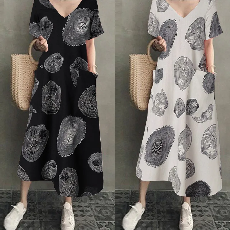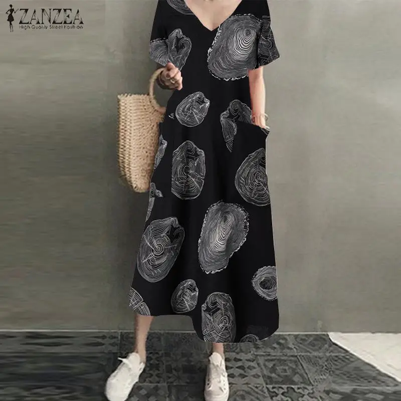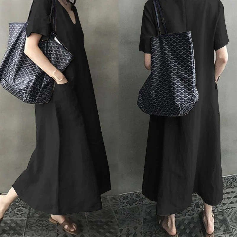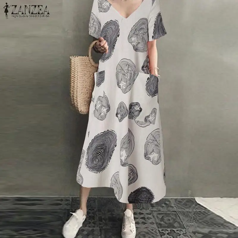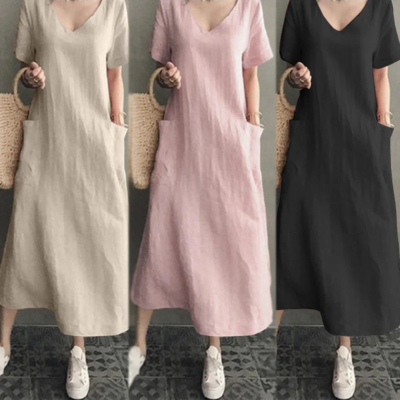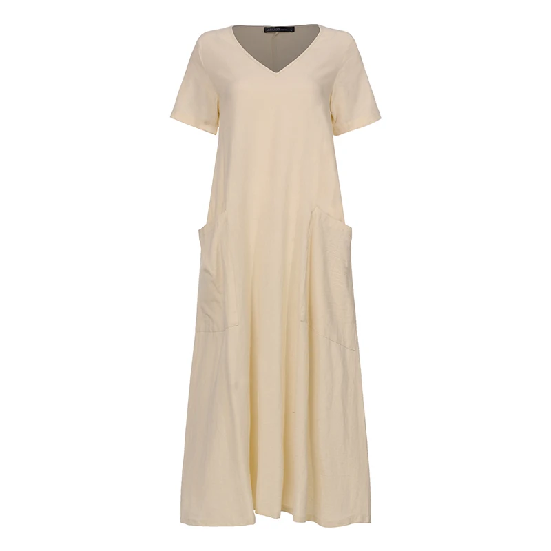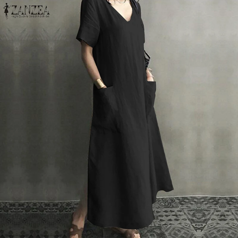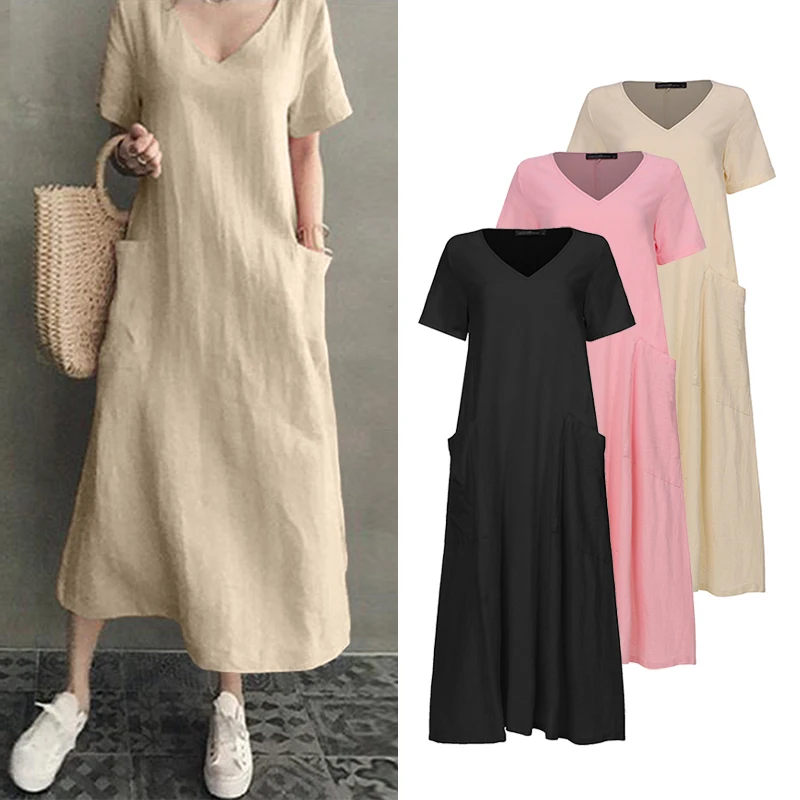 Платье-рубашка женское летнее, винтажный льняной сарафан ZANZEA, Повседневная Туника средней длины с V-образным вырезом, однотонная женская одежда, 2022