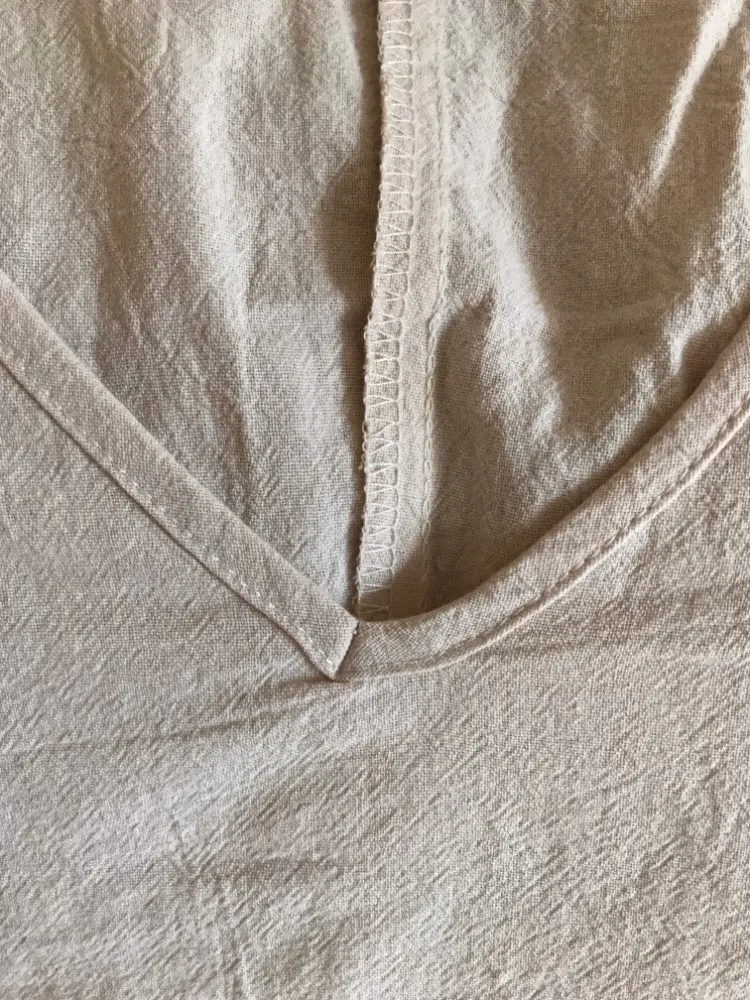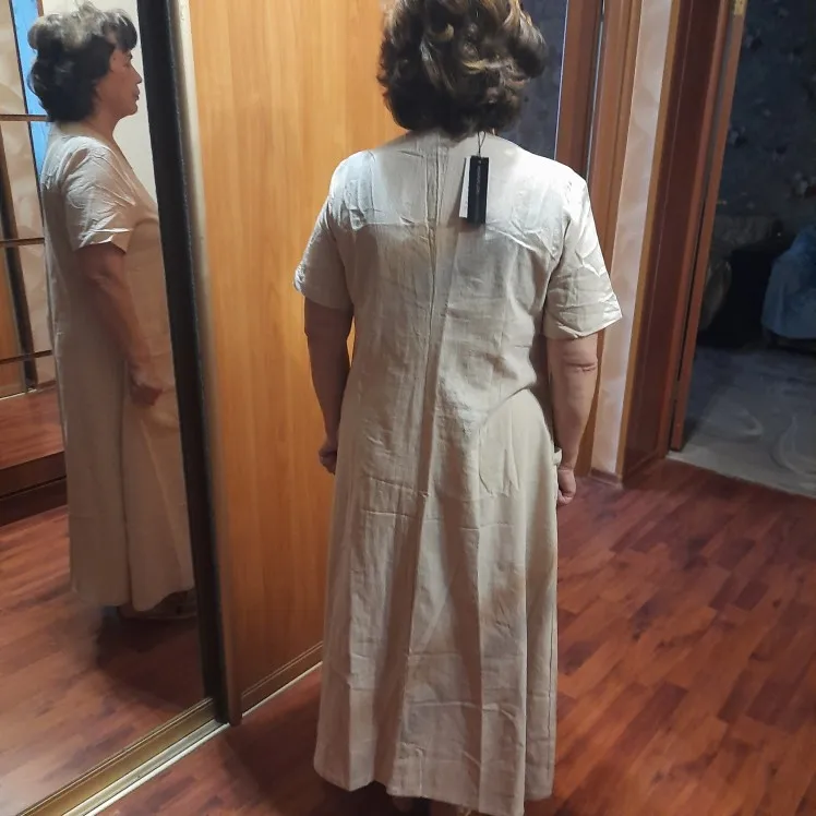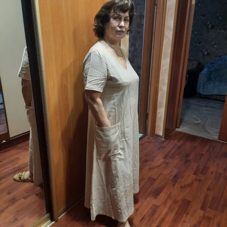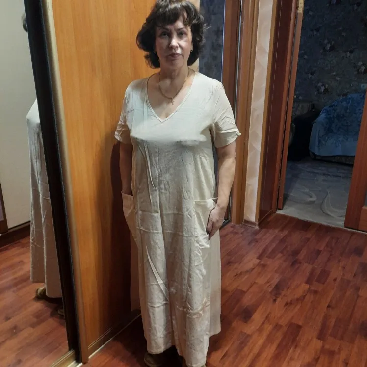 Ткань очень понравилась, легкая с интересной выделкой, свободный летящий стиль. Но, вырез перекошен!!! Визуально это центр платья и такой брак! Карманы пришиты на разных уровнях! Буду пытаться исправить. Жаль, испорчена хорошая вещь! Морочиться с возвратом не хочу. Но только три звезды!!!
