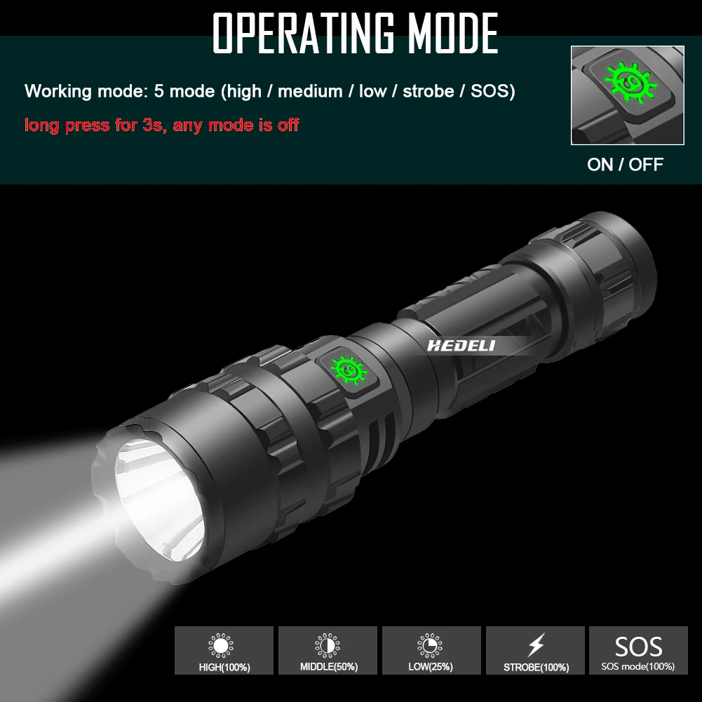 Бренд: HEDELI Название: Тактический фонарик Тип СВЕТОДИОДА: CREE XLamp XM-L2 LED Лампа/срок службы СВЕТОДИОДА: 100000 часов Цвет света: холодный белый Тактический режим: двойной переключатель, переключатель 1: Нажмите кнопку ВКЛ./ВЫКЛ. Переключатель 2: Нажмите, чтобы открыть/выключить Режим работы: 5 режимов (высокий/средний/низкий/Стробоскоп/SOS) Длительное нажатие для 3 s, любой режим выключен Тип батареи: 1x18650 выпуклая батарея Цвет корпуса: черный Материал: алюминиевый сплав Вес нетто факела: 135 г Размер: 148 мм (5,83 дюйма) * 37 мм (1,46 дюйма) * 26 мм (1,02 дюйма) Перезаряжаемый: Прямая зарядка через USBТеплое напоминание:Пожалуйста, не светите твердым светом прямо в глаза, особенно дети!