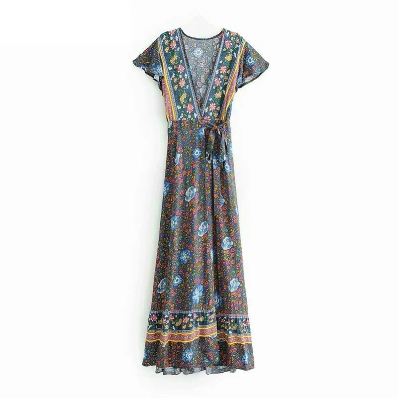 Женское платье-макси с цветочным принтом, V-образным вырезом и рукавом летучая мышь