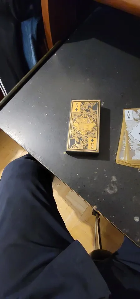 Этот набор карт очень красивый. Он поставляется в этой красивой черной коробке th1t с золотой подкладкой. Верхняя часть коробки была скреплена золотой лентой. Действительно красиво, но когда я вытянул его, золотые хлопья сошли с ленты (немного запутанный). Карты действительно хорошие, они чувствуют себя гладкими, не оставляет следов от блеска с золотых сторон карты. Мне нравится та часть, где вы можете почти посмотреть через карту с пасмурным исходом. Я бы порекомендовал, плюс я получил карты в течение 3 недель. Которая двойной для сумасшедшего времени.! Я бы хотел поиграть сразу два, теперь мне нужно подождать, прежде чем я смогу играть на канасте или мосте;-