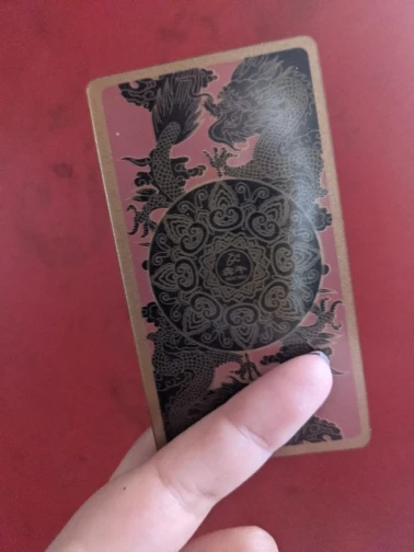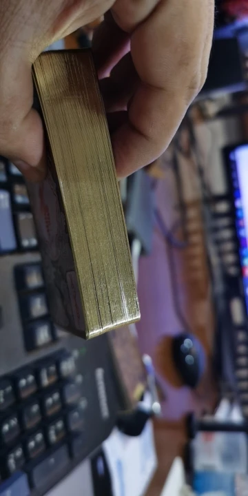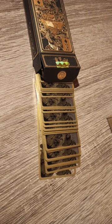 Карты приехали за 2 недели в Украину, доставка НП. Упакованы хорошо, все цело. Золотое тиснение на коробке, позолоченный срез колоды, но на самих картах рисунок желтый, не блестящий. В целом хорошо, товар и продавца рекомендую!