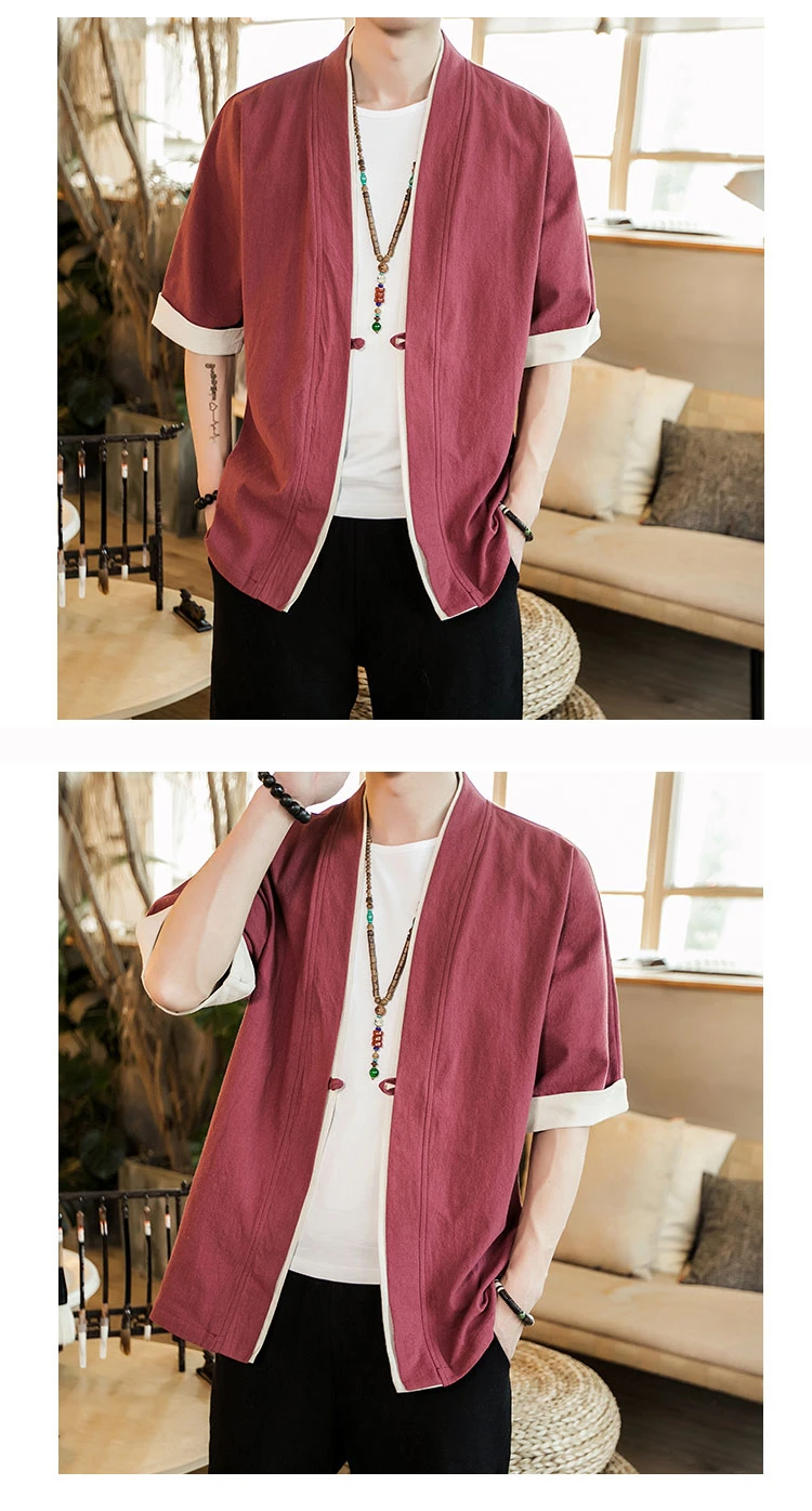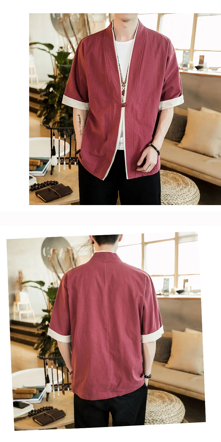 #4321 летняя футболка с коротким рукавом для мужчин из хлопка и льна, цветное кимоно рубашка мужской кардиган китайский Стиль размера плюс, на каждый день, Ретро стиль