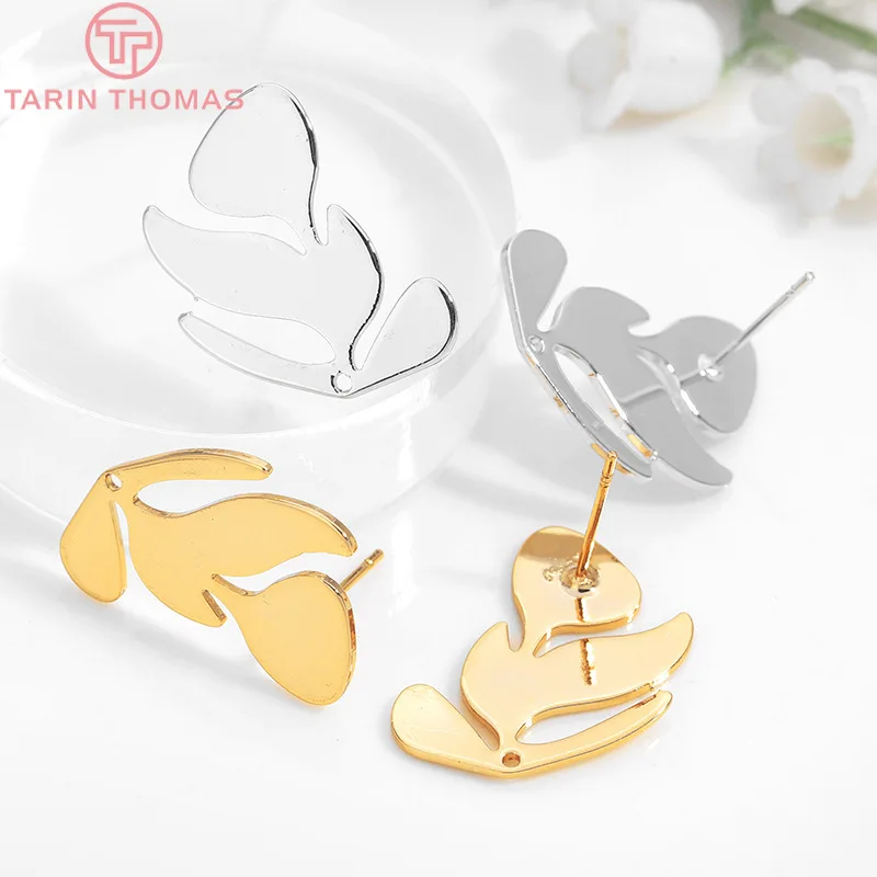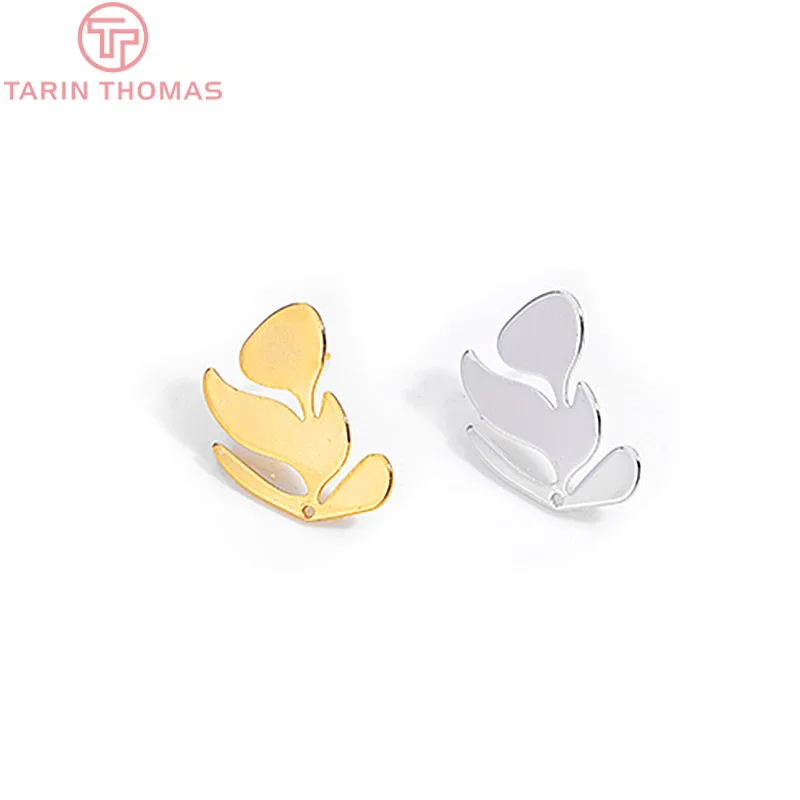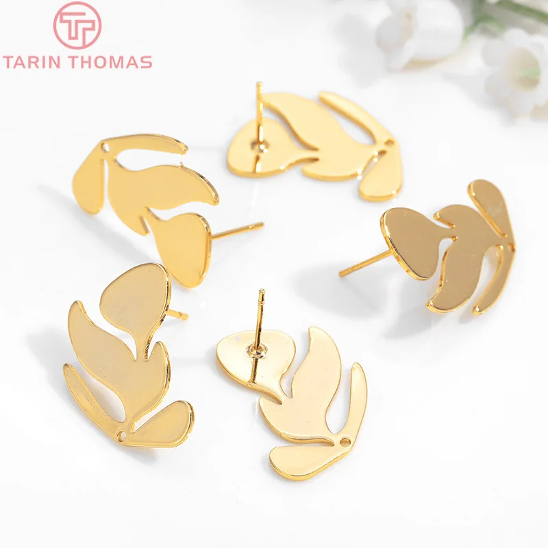 6 шт., латунные серьги-гвоздики с листьями дерева, 21 х17 мм