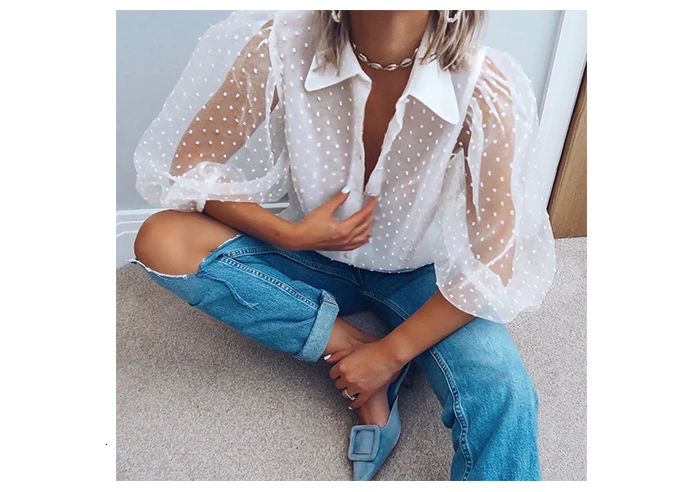 Женская прозрачная блузка в горошек, летняя белая блузка с длинными...